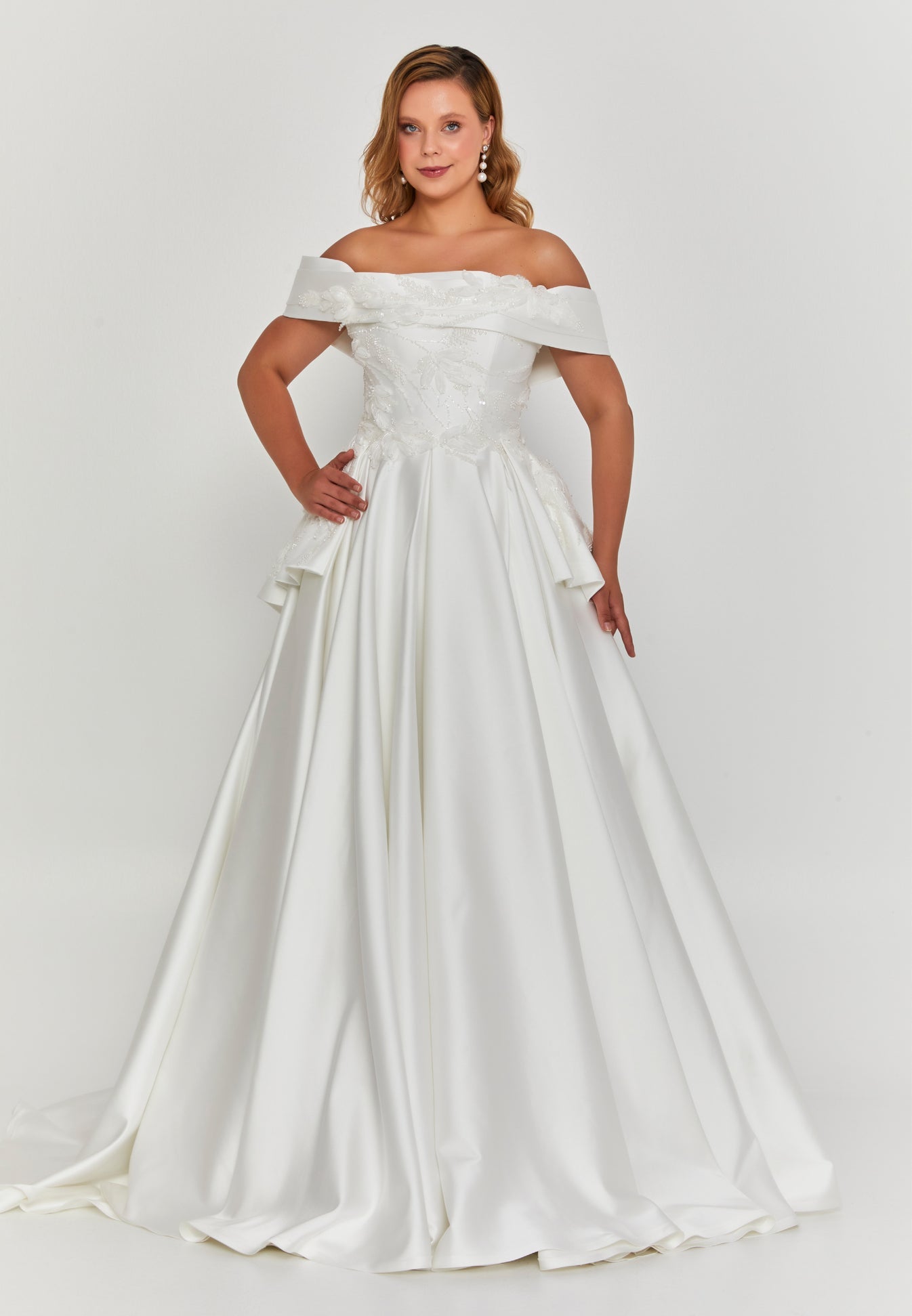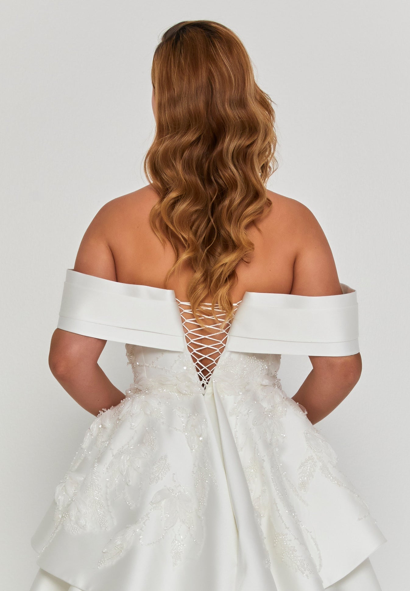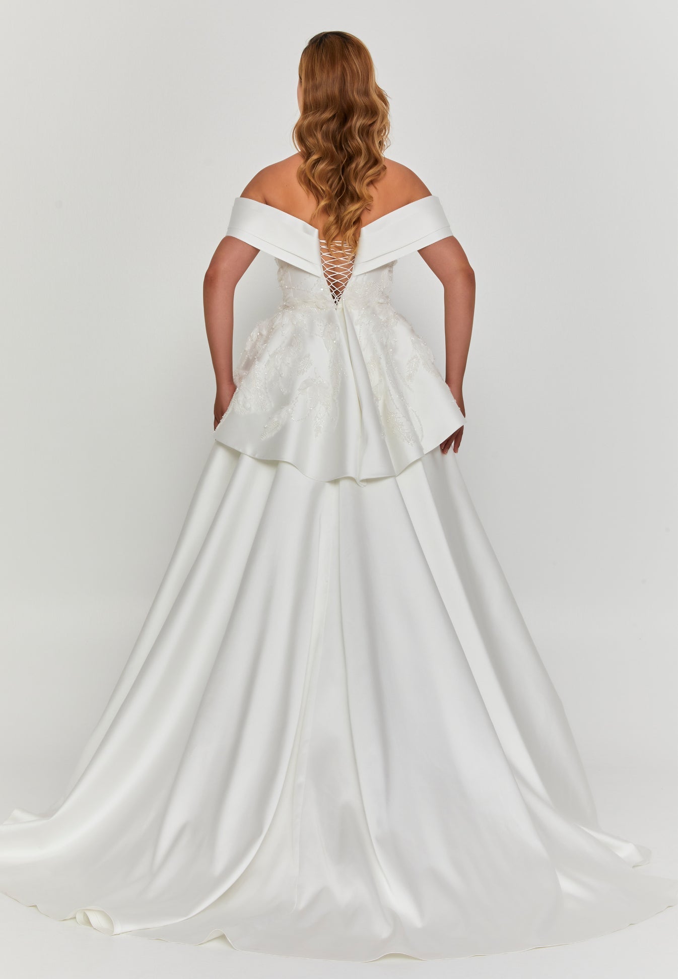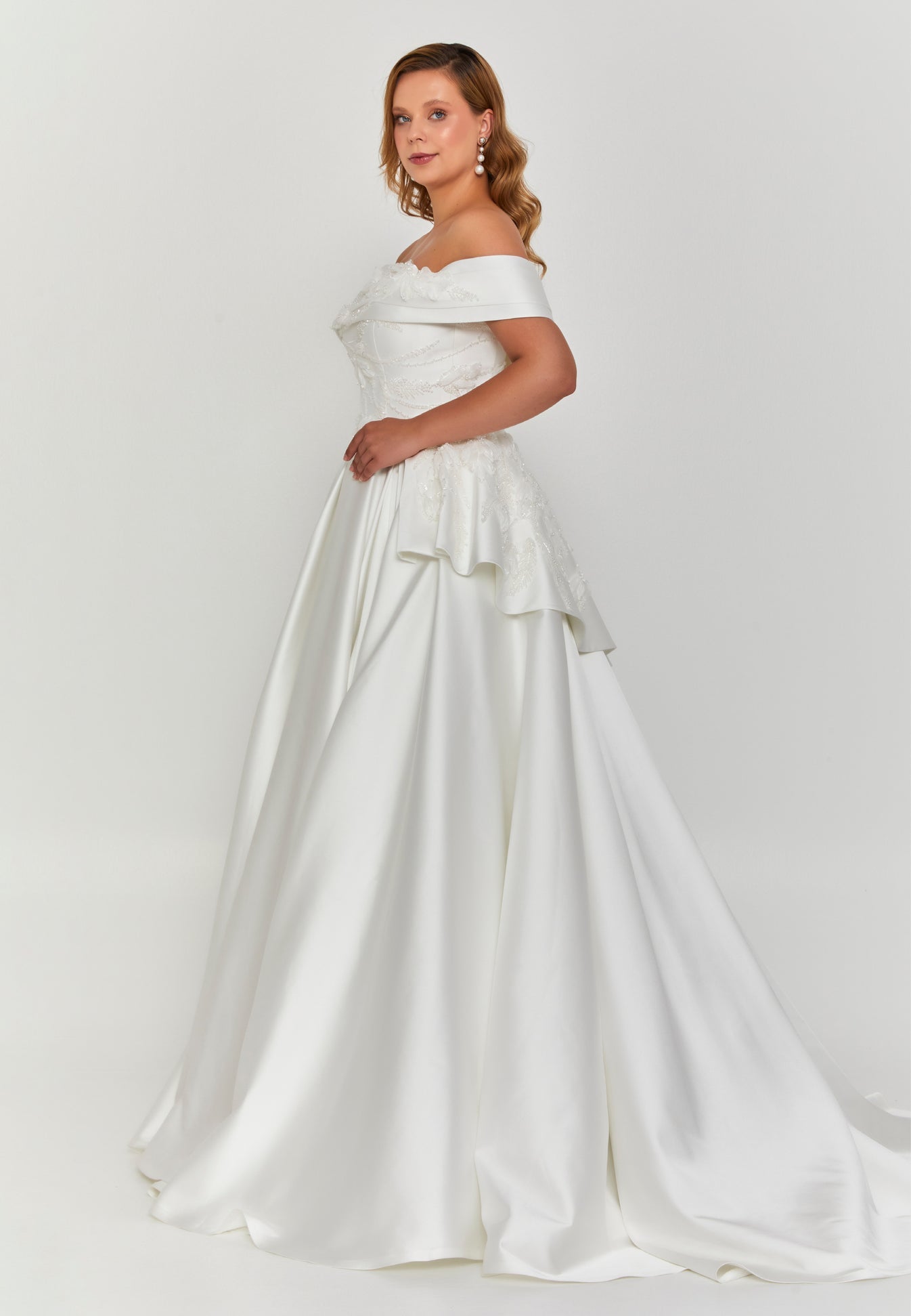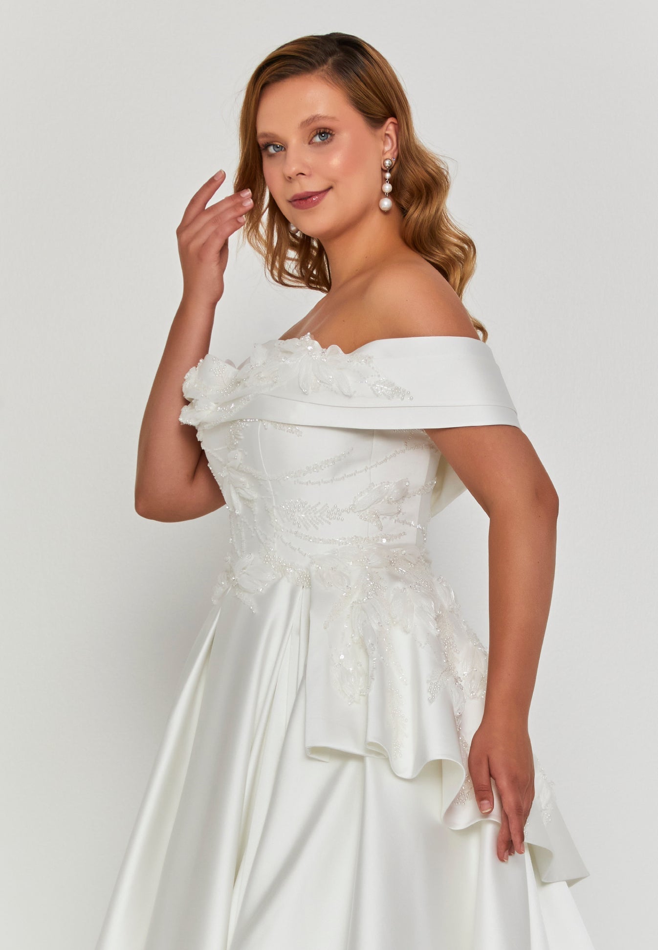 The off-the-shoulder neckline frames the collarbone with soft, sculpted structure, while delicate embroidery adds a touch of texture and charm to the bodice. A gentle peplum overlay cinches the waist and flatters every curve, cascading into a full satin skirt that flows with subtle volume and quiet drama.