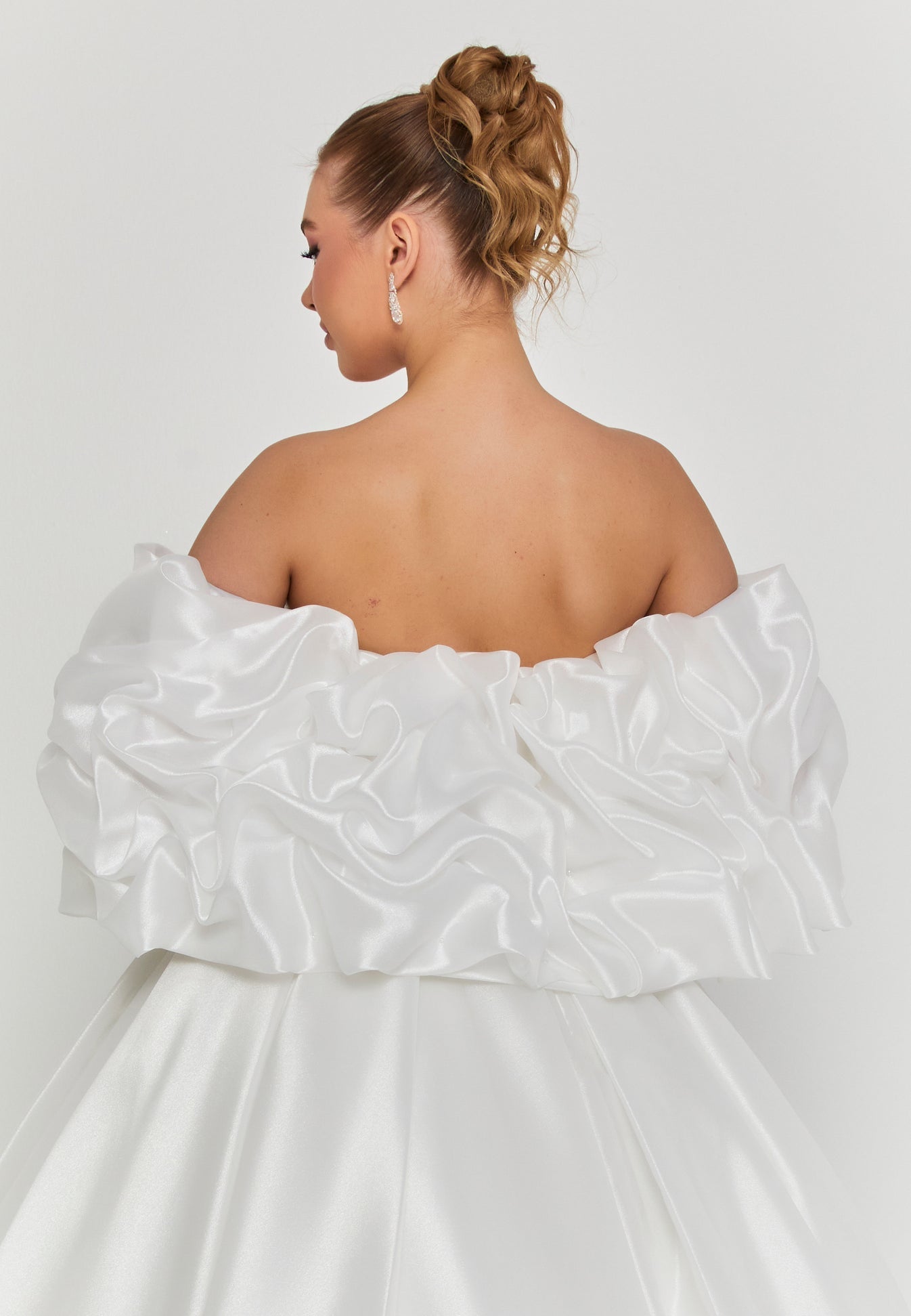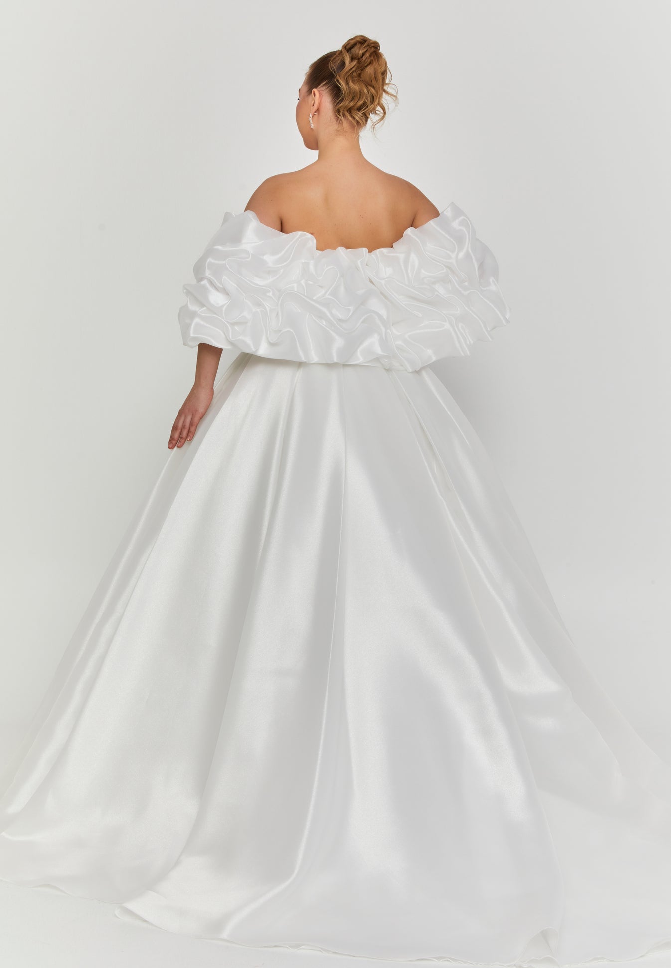 • Detachable puffed satin sleeves for a dramatic off-the-shoulder look