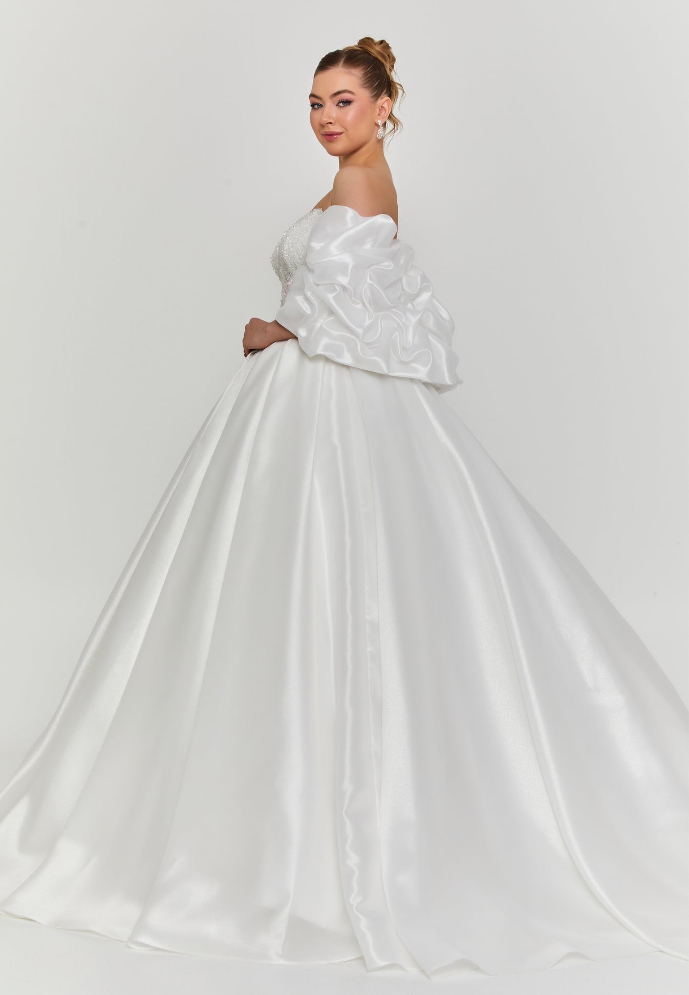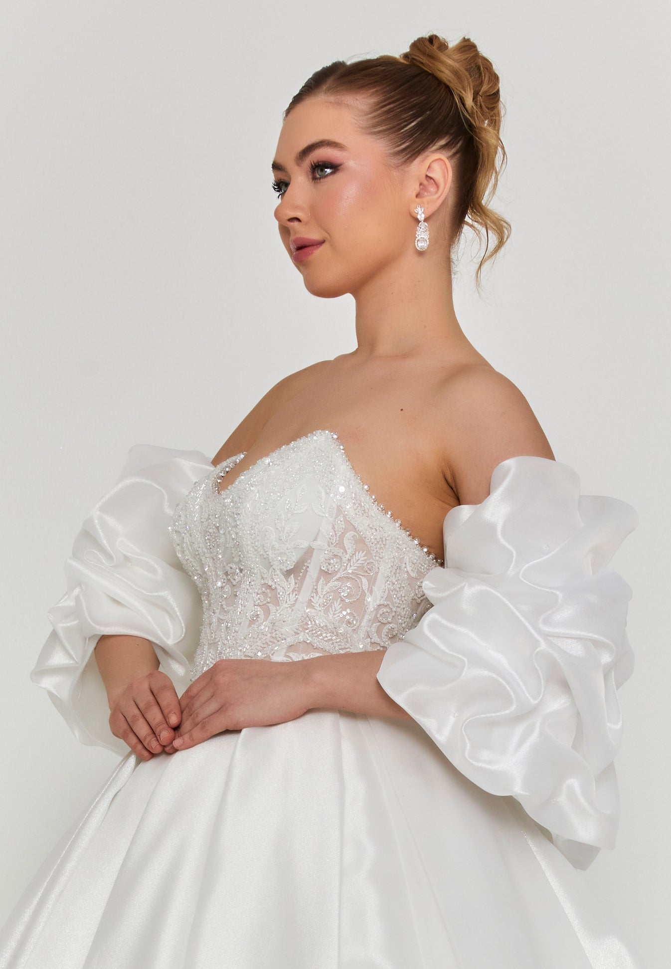 The fitted bodice is a work of art: sheer lace, soft sparkle, and subtle corsetry combine to shape and support, while the sweetheart neckline adds a timeless touch. But the real showstopper? The voluminous satin skirt, pleated for fullness and movement, and paired with the boldest puff sleeves you've ever seen. Detachable, no less, for a second look that stuns.
