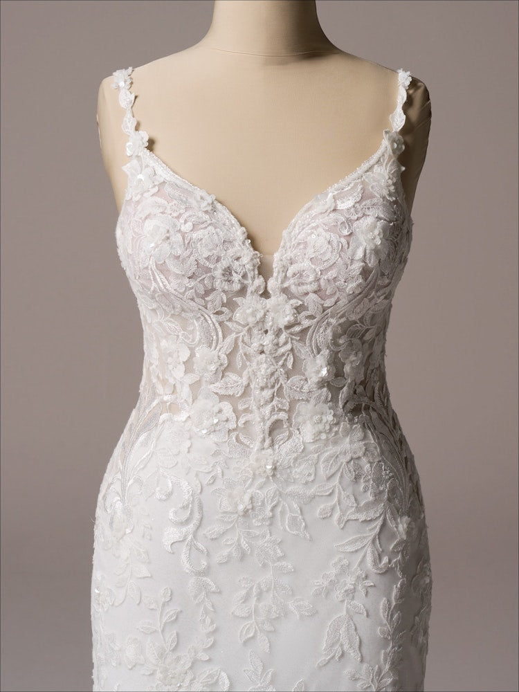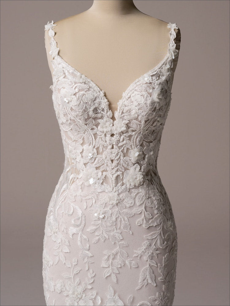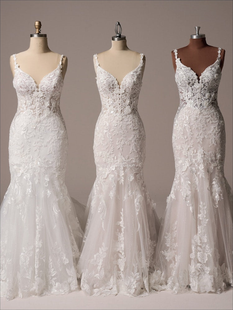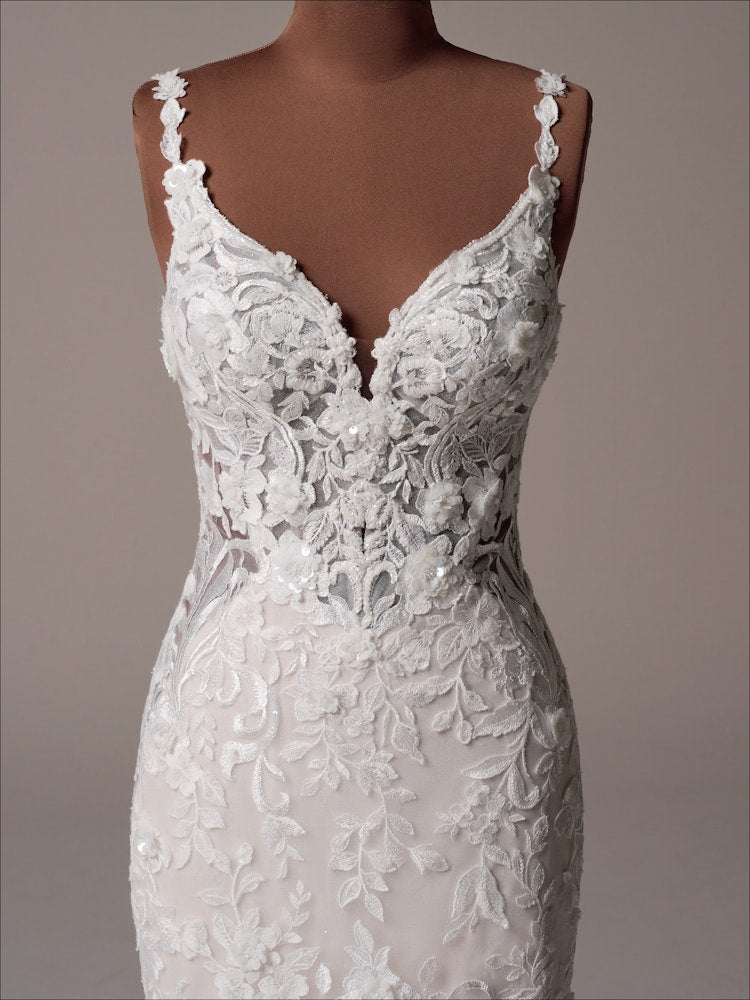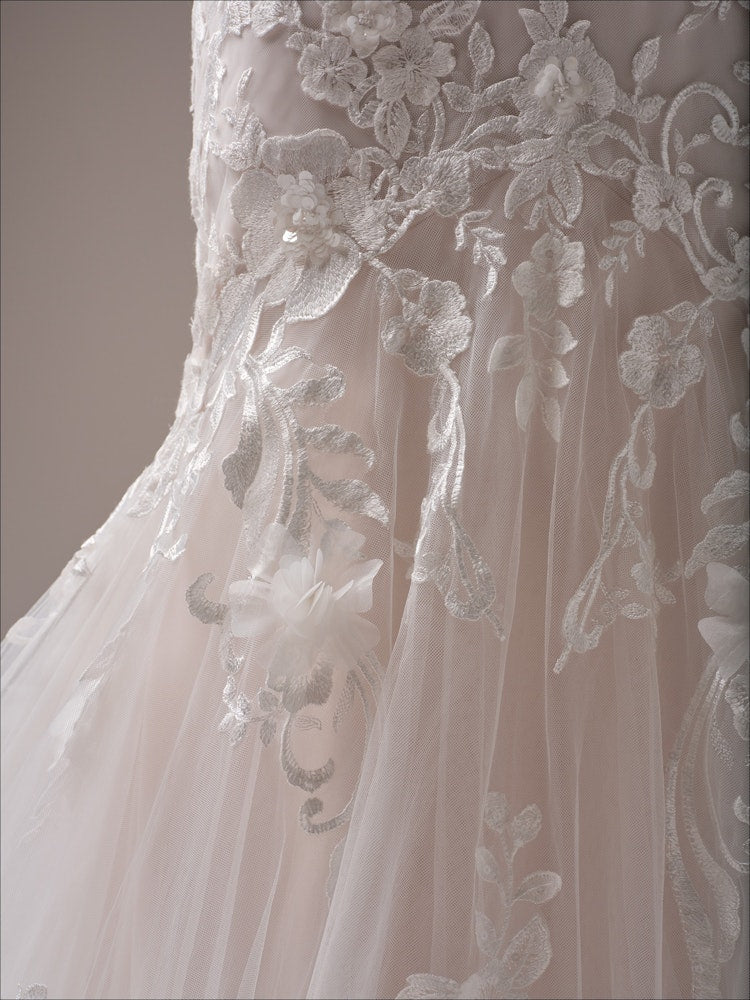 This gown is all about timeless beauty with a soft, romantic twist. The fitted bodice features delicate floral lace that trails organically over the hips and into a dreamy tulle skirt. It’s the kind of lace that feels like it was placed just for you. Subtle, dimensional, and full of detail the closer you look.