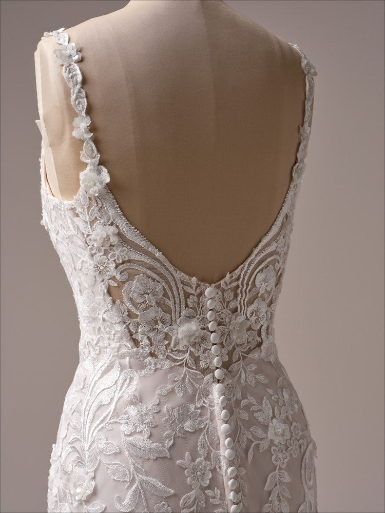 The neckline is feminine without being fussy, and the illusion scoop back adds just the right amount of charm. A line of buttons trails down the back for that extra bridal moment, while the gentle flare of the skirt brings a sense of movement and lightness that’s perfect for dancing, or simply floating down the aisle.