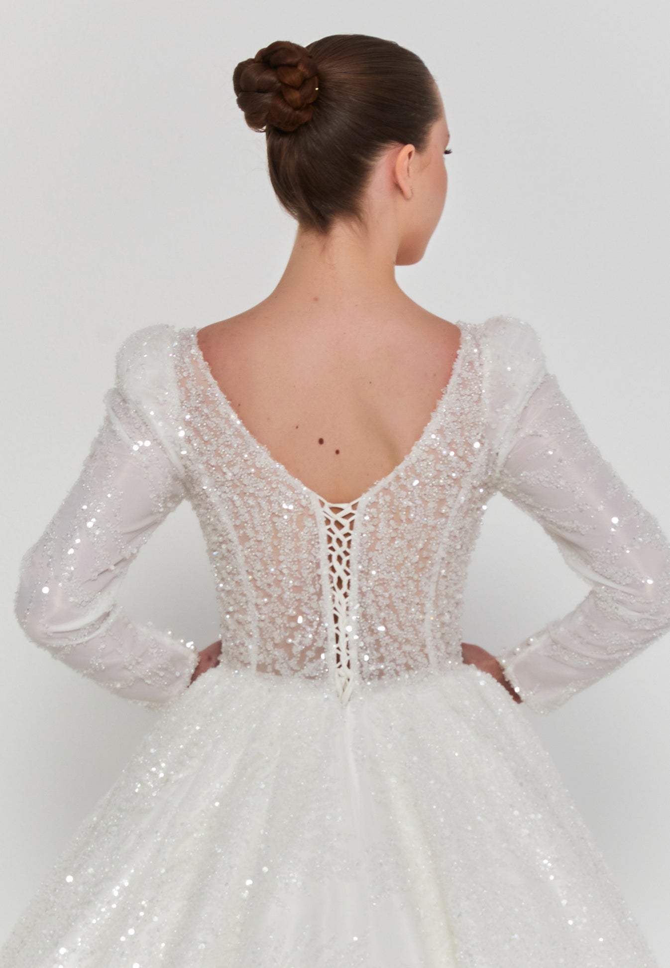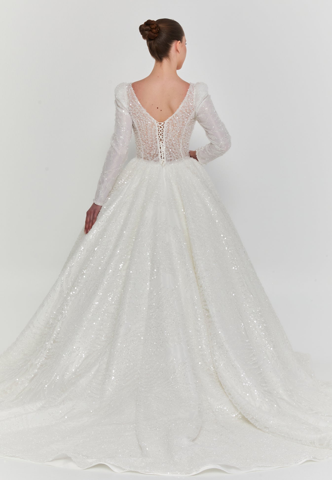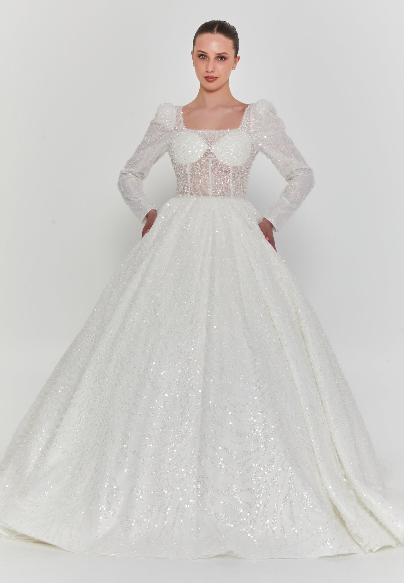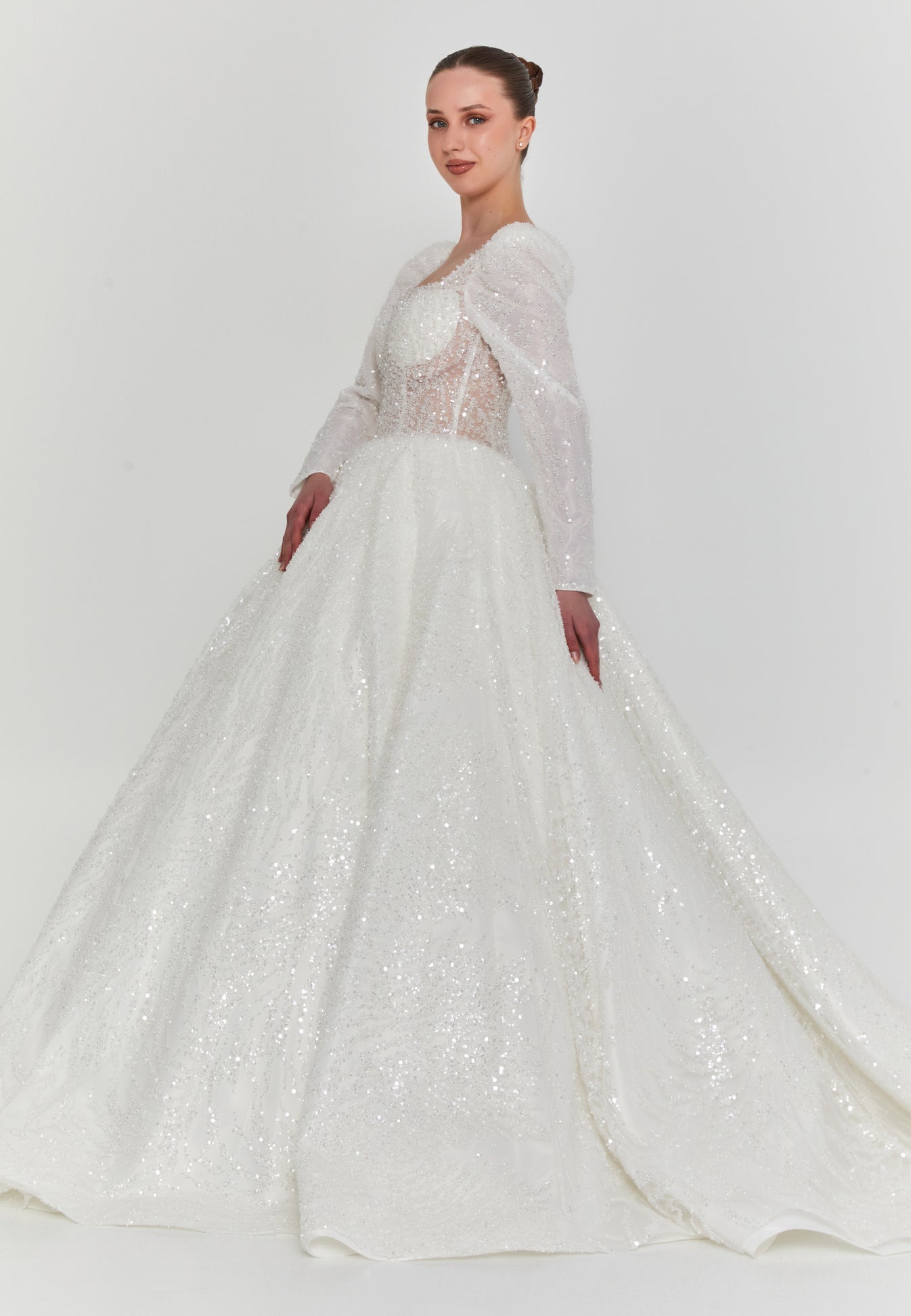 This design is a love letter to classic romance with a modern, daring twist. The bodice stuns with its sheer corset construction and exposed boning, framed by softly puffed long sleeves that add both structure and softness. Sparkling beadwork and sequins catch every flicker of light, creating an almost liquid shimmer from every angle.