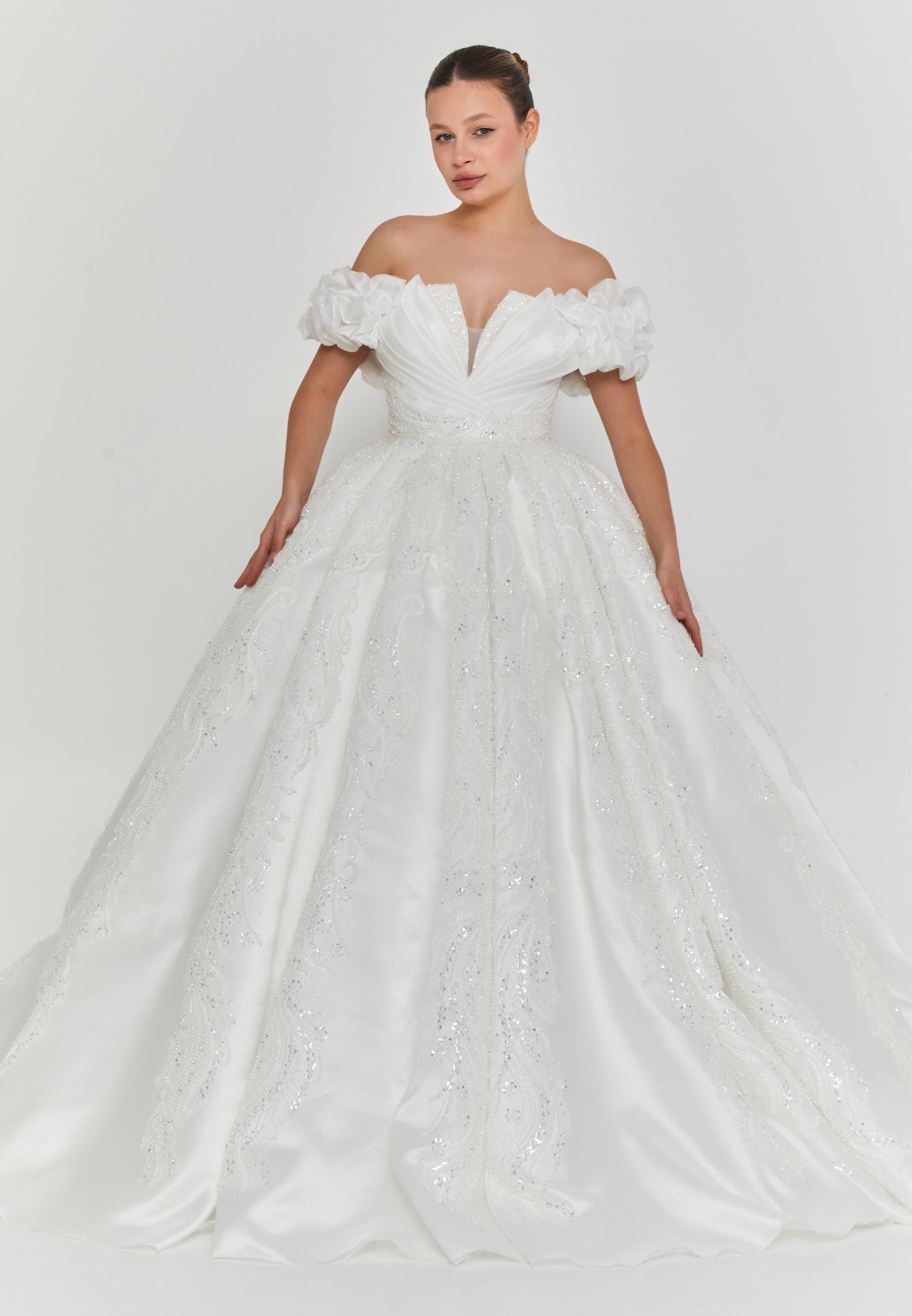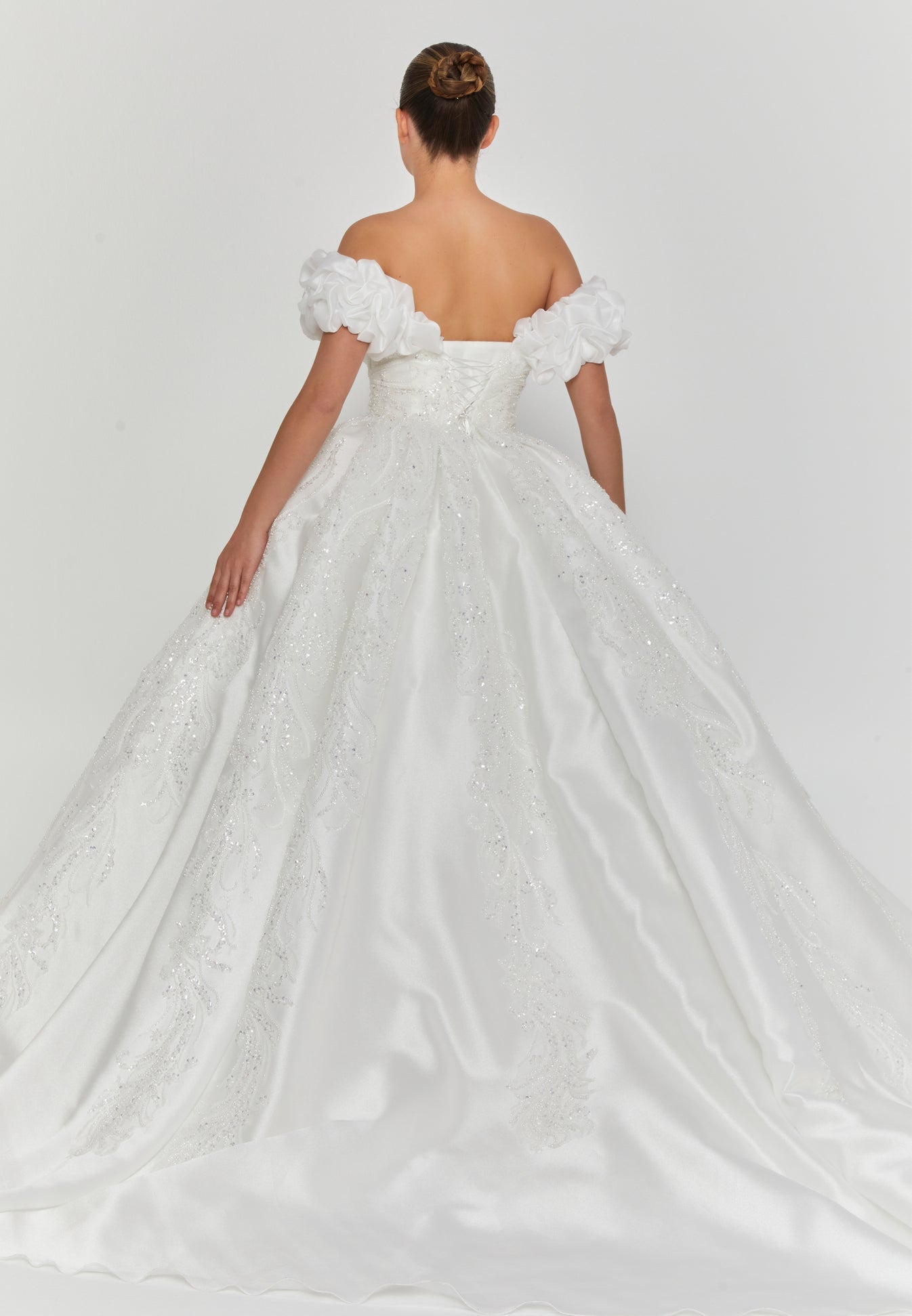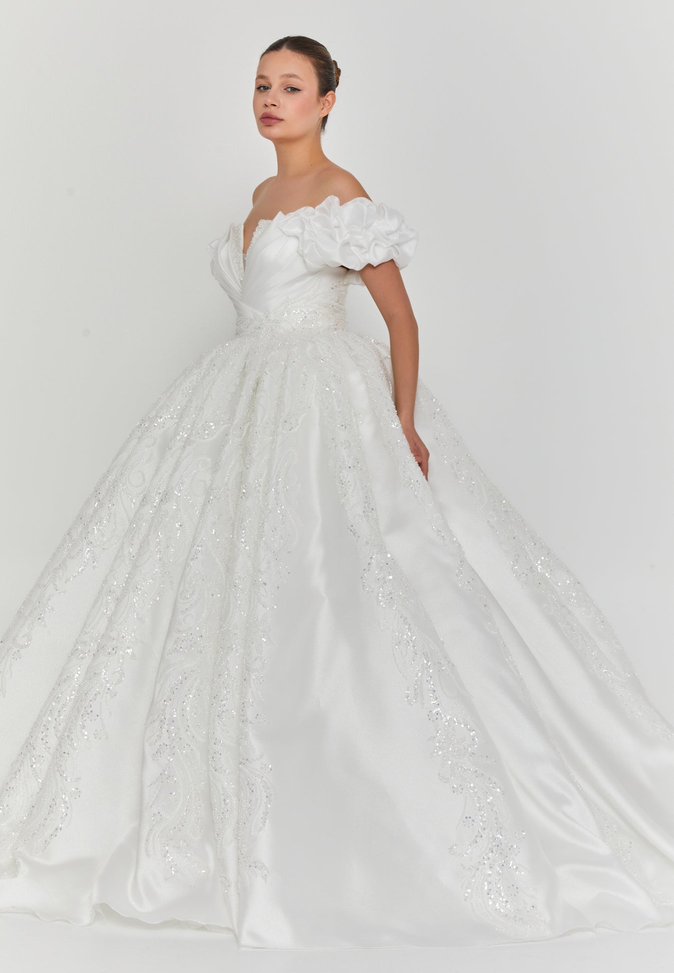 This statement ballgown stuns from the first glance with its off-the-shoulder puff sleeves and pleated sweetheart neckline. The bodice is subtly structured for shape and support, while the full skirt brings all the grandeur. Intricate glitter embroidery flows in soft, cascading patterns from waist to hem, catching the light with every movement.