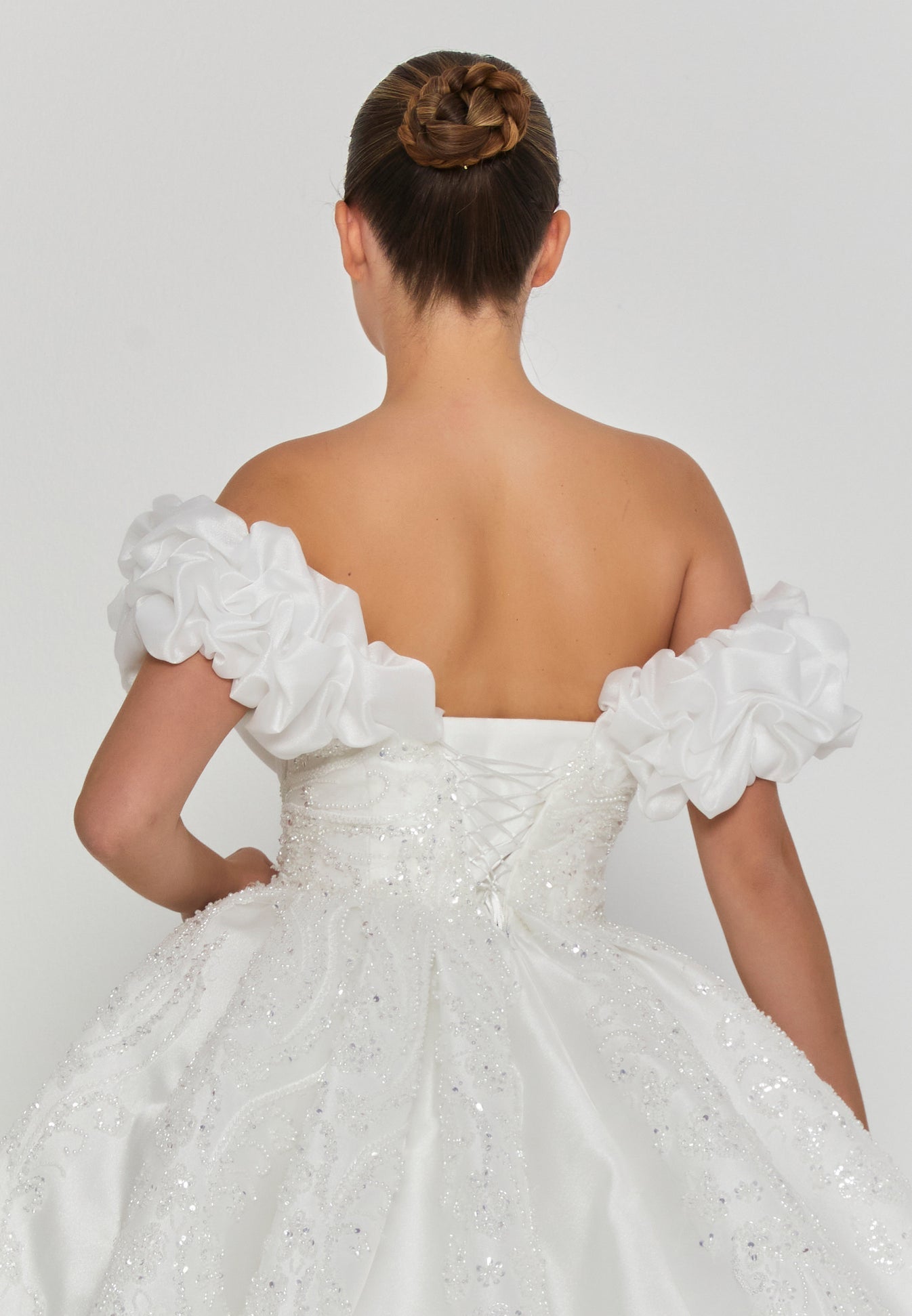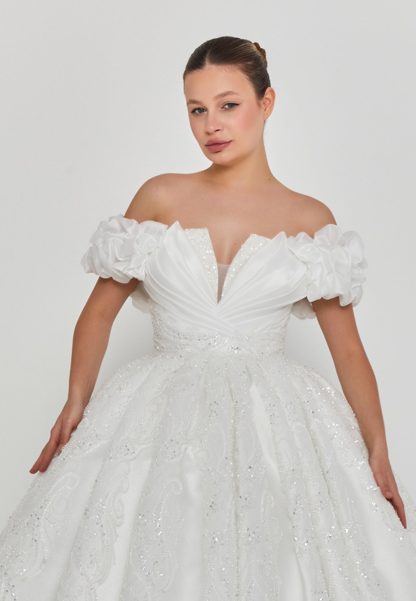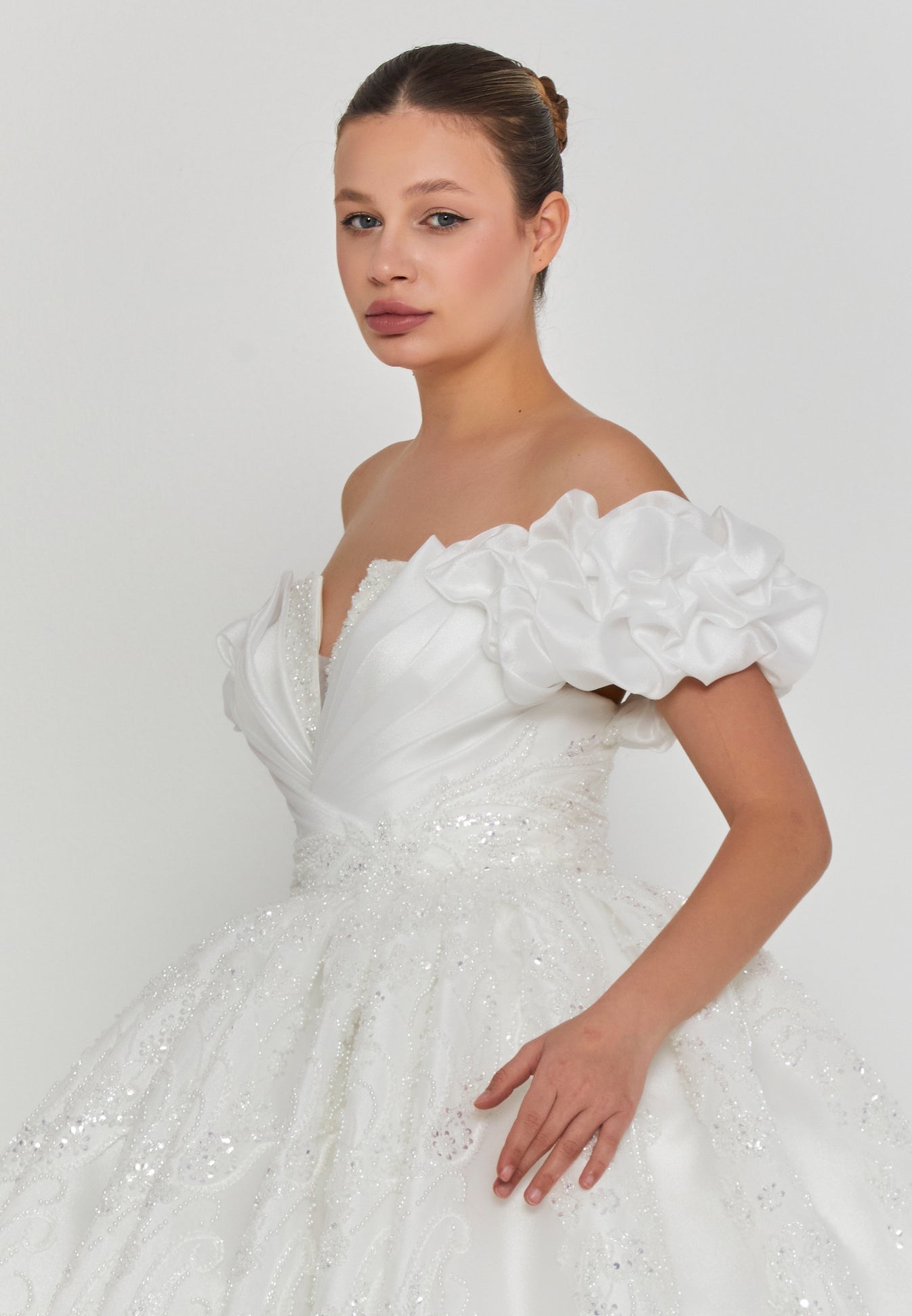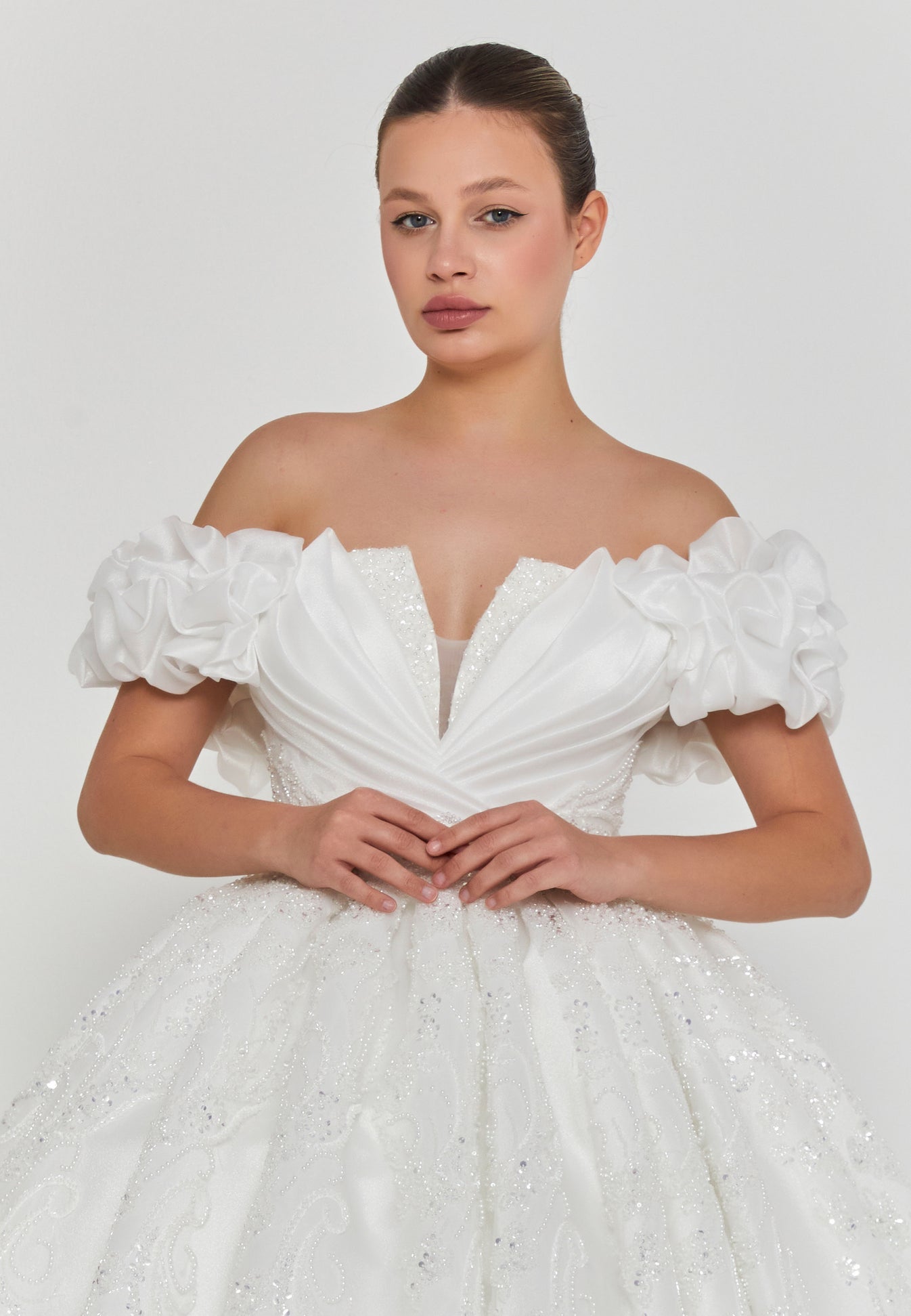 This statement ballgown stuns from the first glance with its off-the-shoulder puff sleeves and pleated sweetheart neckline. The bodice is subtly structured for shape and support, while the full skirt brings all the grandeur. Intricate glitter embroidery flows in soft, cascading patterns from waist to hem, catching the light with every movement.