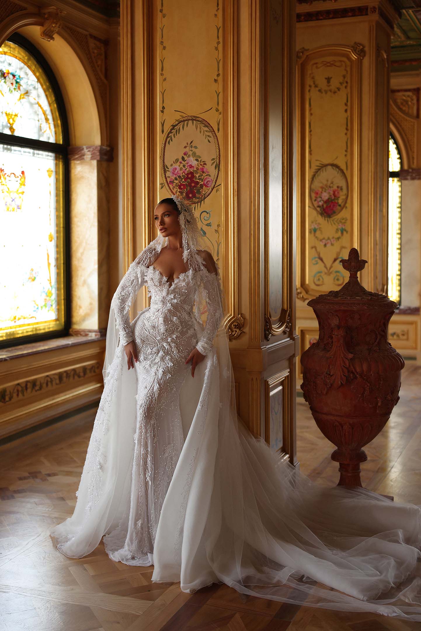 Delicate off-shoulder sleeves bloom into a sweeping tulle cape that drapes like a royal train. Each movement leaves a shimmer, like dew on morning petals.