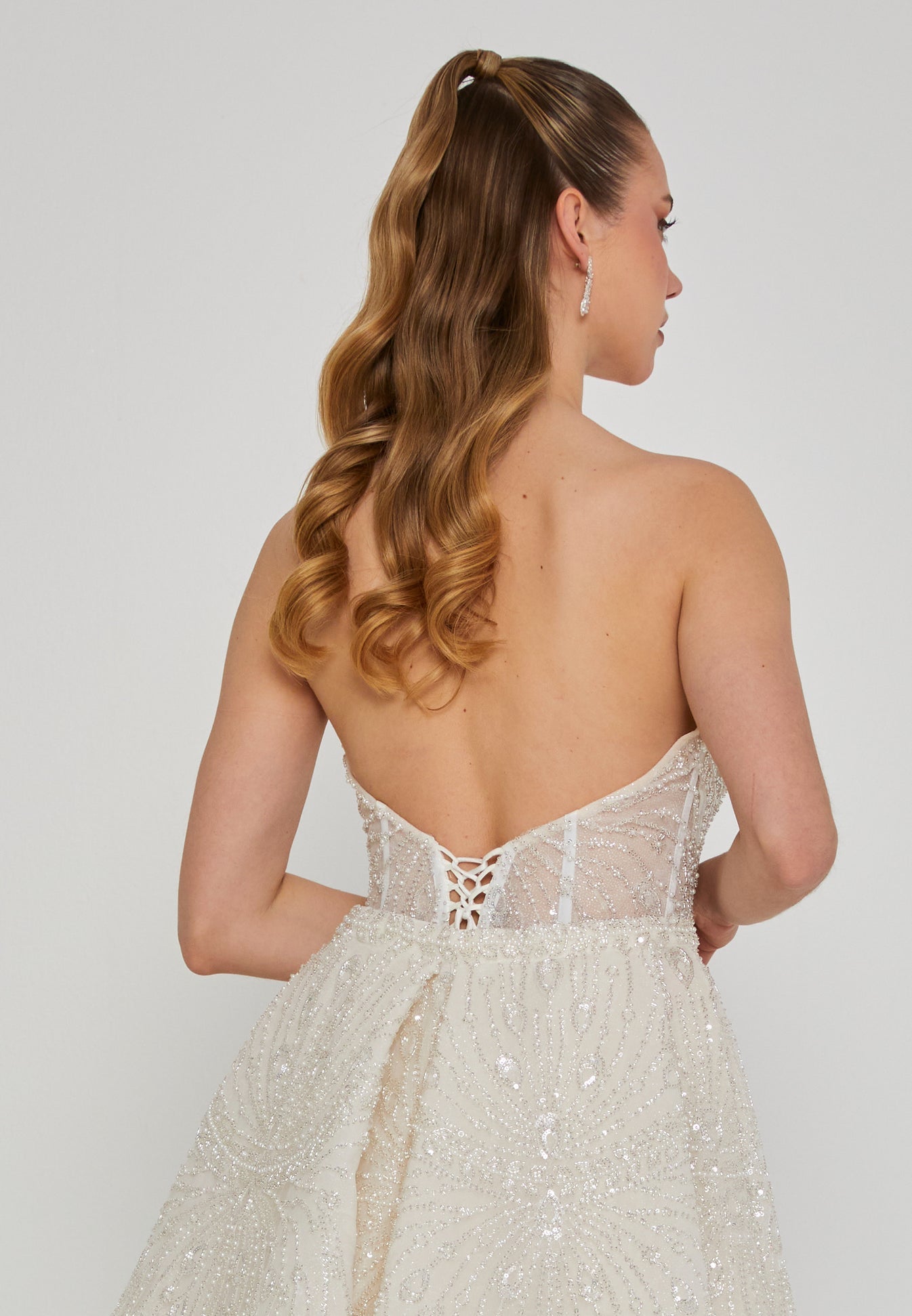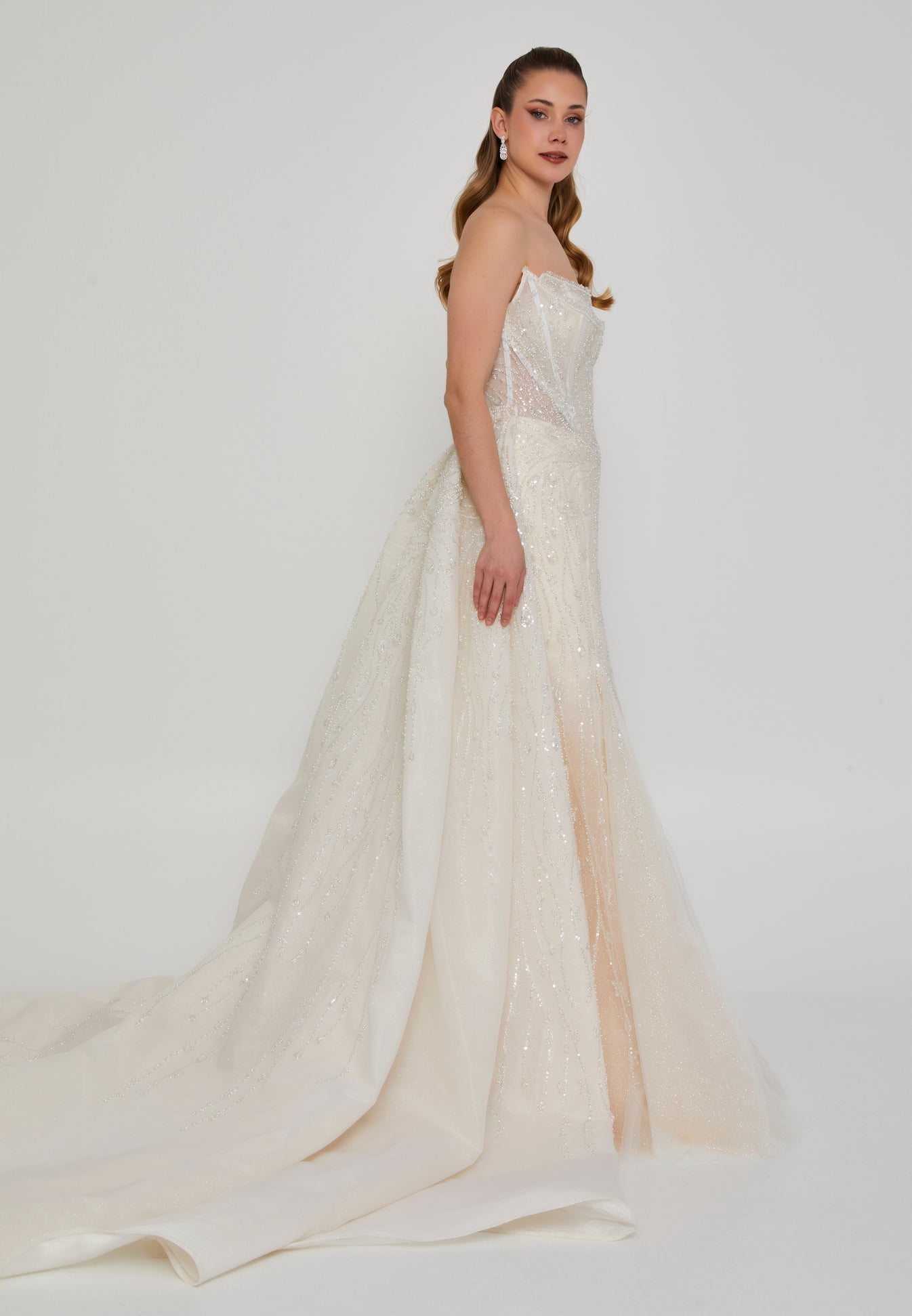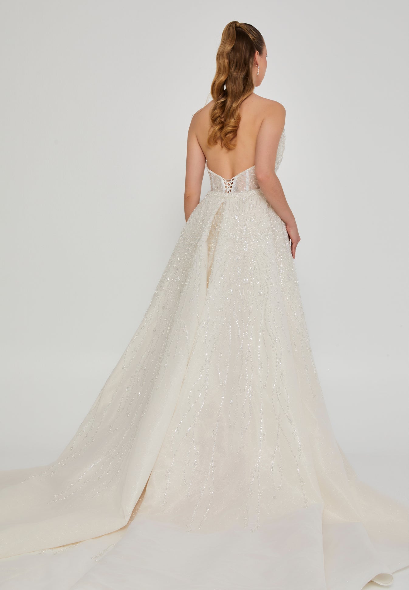 This is your red carpet moment in bridal form. A gown that sparkles with every step, every turn, and every flash of light. The corset bodice is sheer and sculpted, with a delicate notch neckline and soft boning for structure and shape. The fit-and-flare silhouette flatters naturally, while a detachable overskirt adds all the dramatic volume you could dream of, without weighing you down.