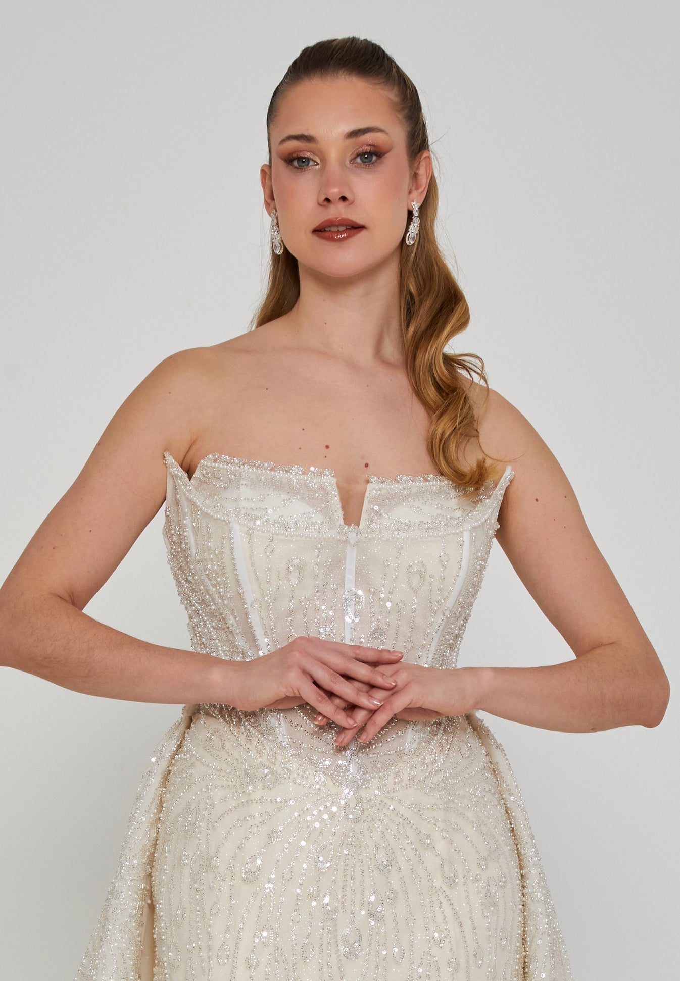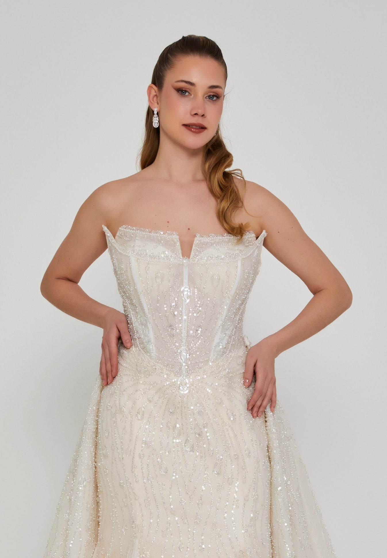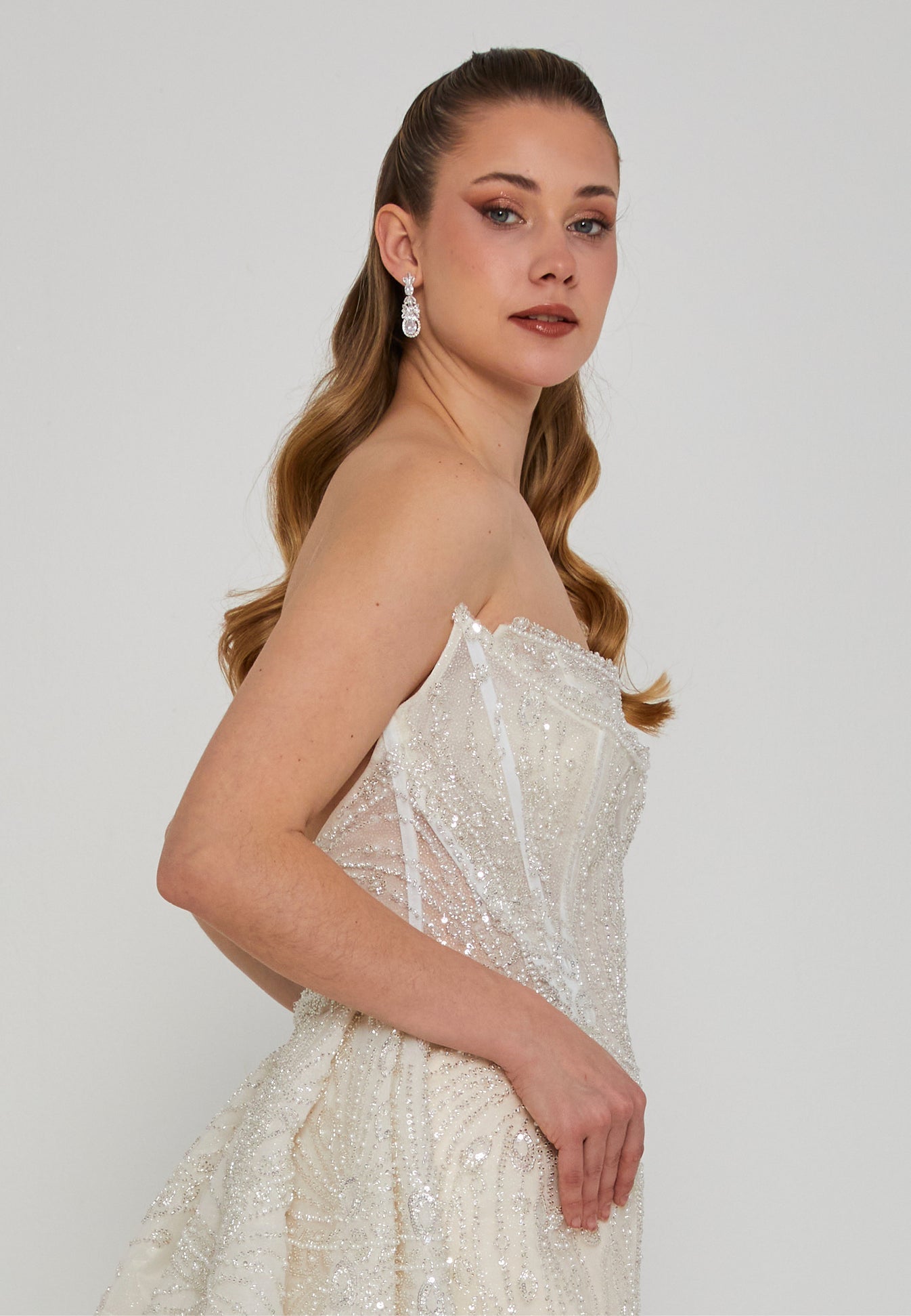 This is your red carpet moment in bridal form. A gown that sparkles with every step, every turn, and every flash of light. The corset bodice is sheer and sculpted, with a delicate notch neckline and soft boning for structure and shape. The fit-and-flare silhouette flatters naturally, while a detachable overskirt adds all the dramatic volume you could dream of, without weighing you down.
