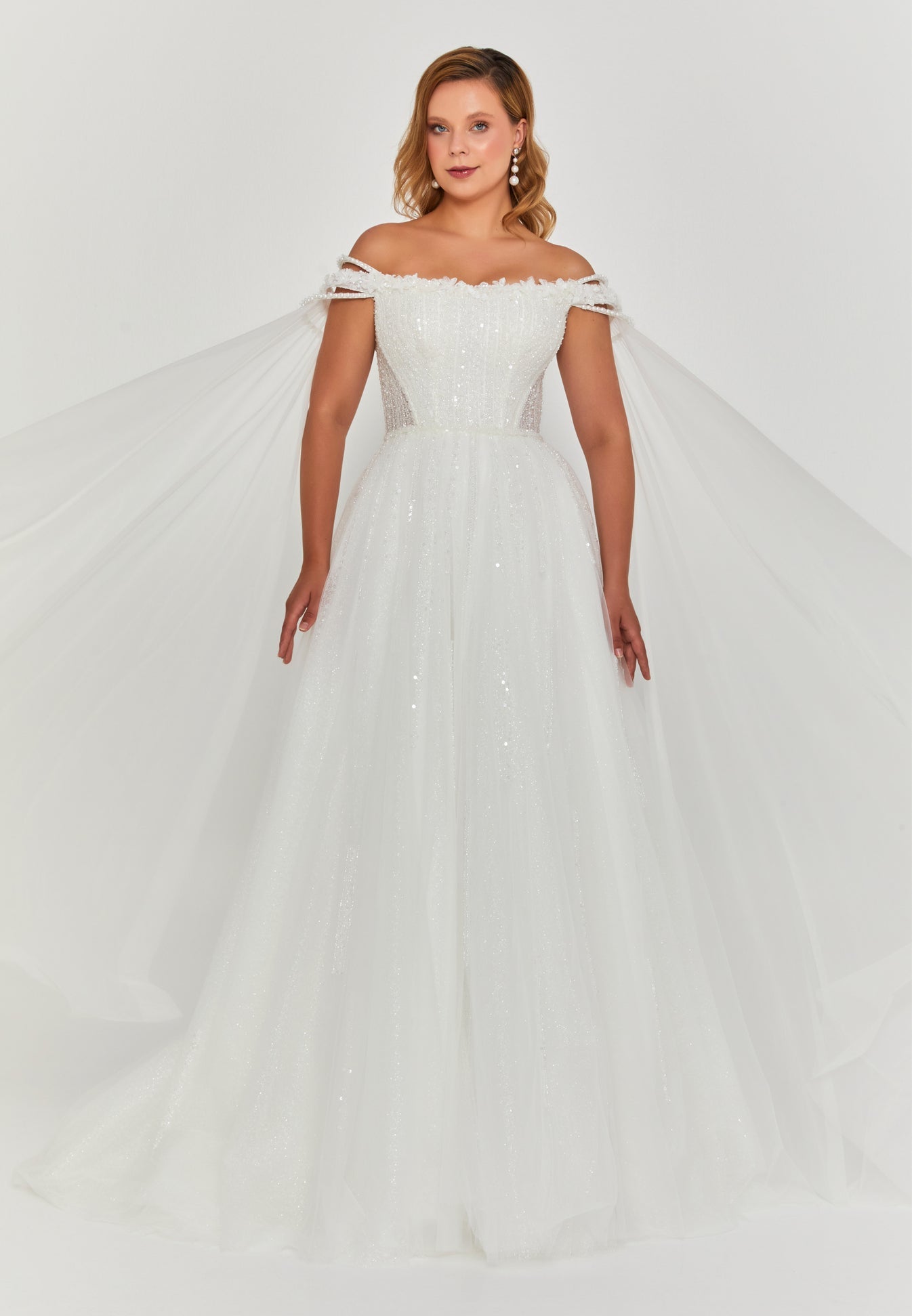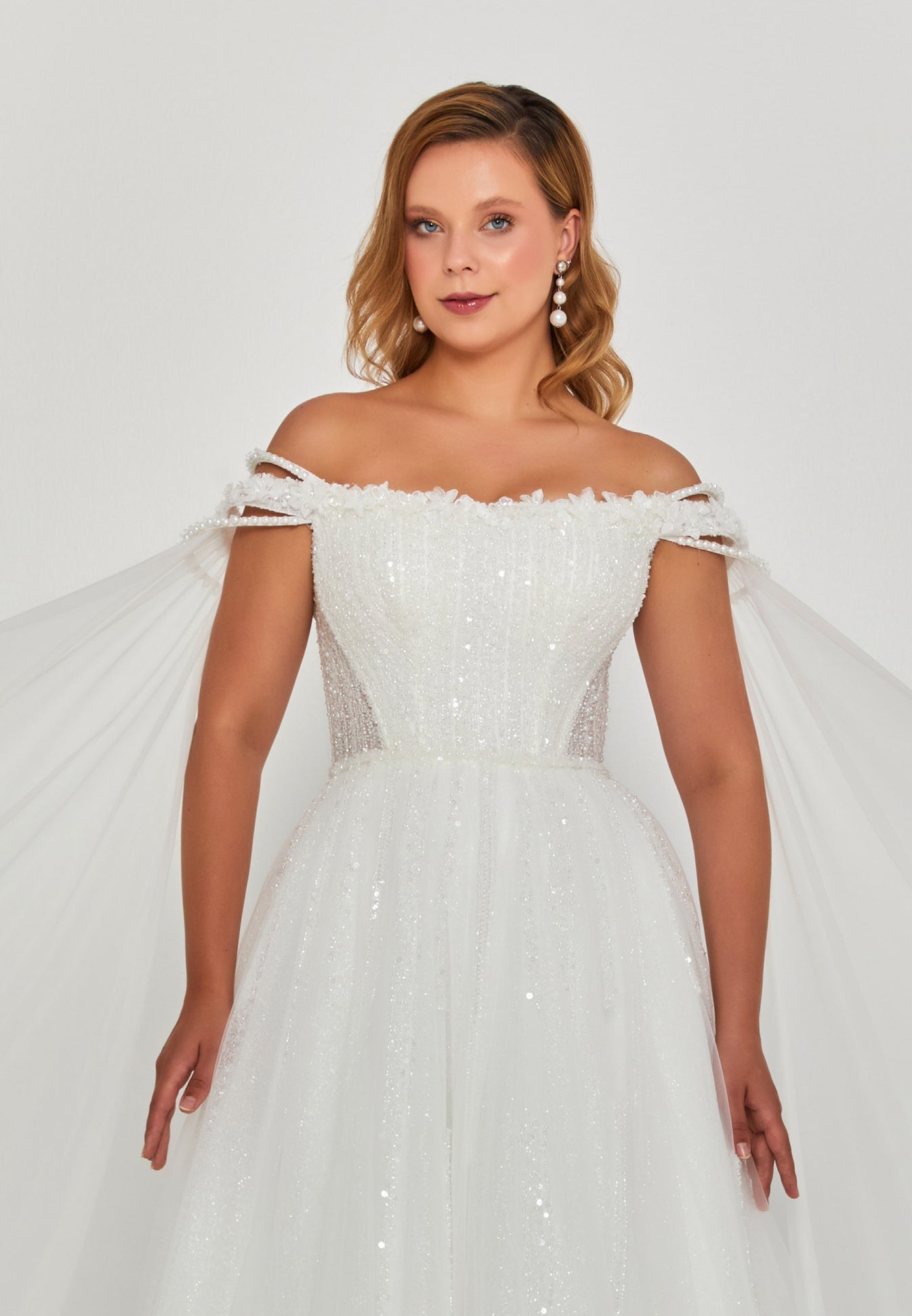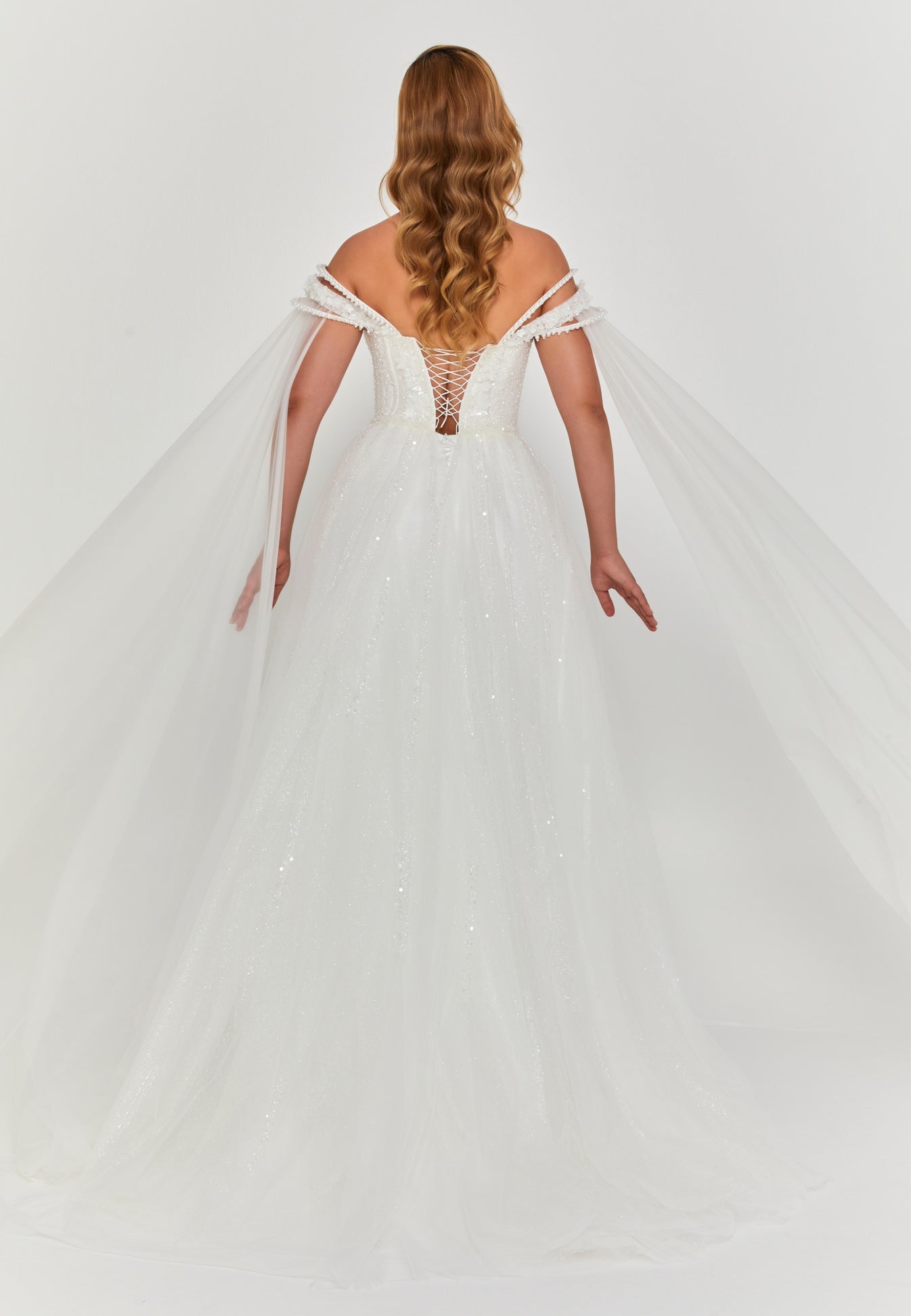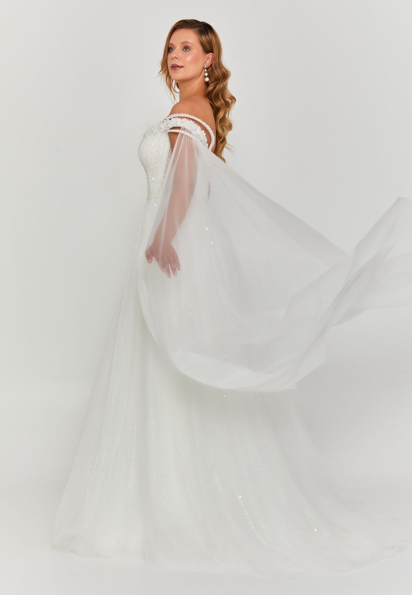 Contact for PriceThere’s something timeless about a gown that captures light, movement, and emotion all at once. The Divine wedding gown lives up to its name. A breathtaking blend of softness, sparkle, and modern-day royalty. From the delicate floral detailing on the off-shoulder neckline to the romantic draped tulle that floats behind you like wings, every detail is made for the bride who wants to feel effortlessly magical.