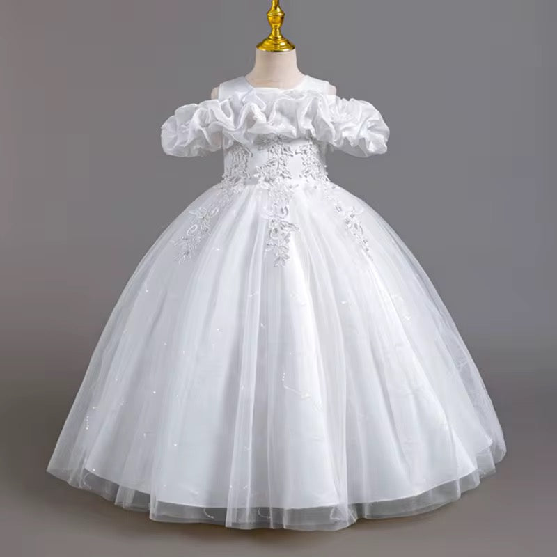 Elykiah is a dress spun from daydreams and garden fairytales. Its full tulle skirt floats with soft volume, while delicate floral appliqués climb like vines across the bodice and waist, blooming in gentle arcs. The off-the-shoulder neckline is crowned with a cloud of gathered organza ruffles. Fluttery and whimsical, like petals caught mid-breeze. It’s the kind of gown that invites twirls and whispered secrets among flowers.