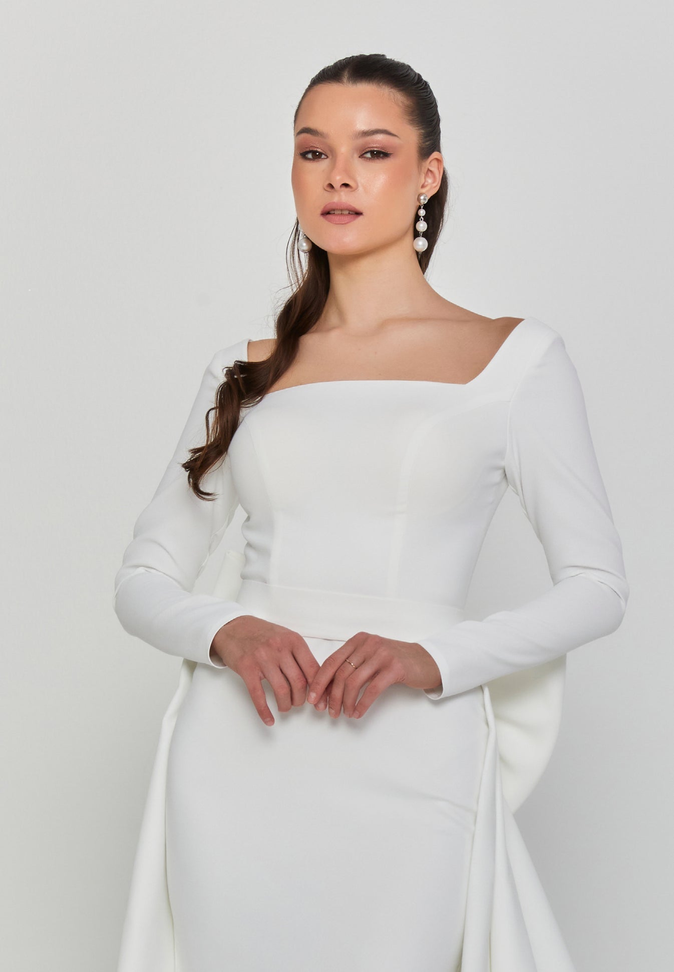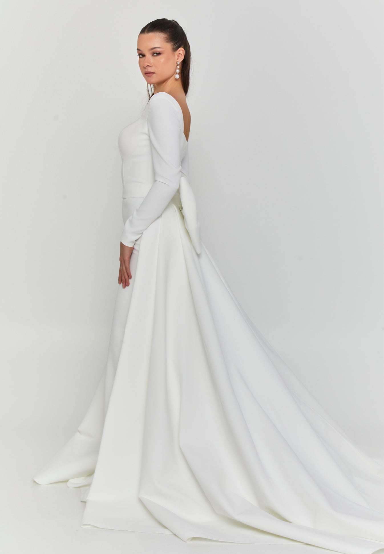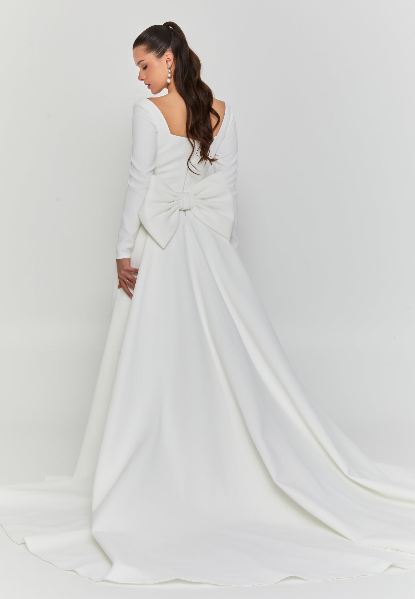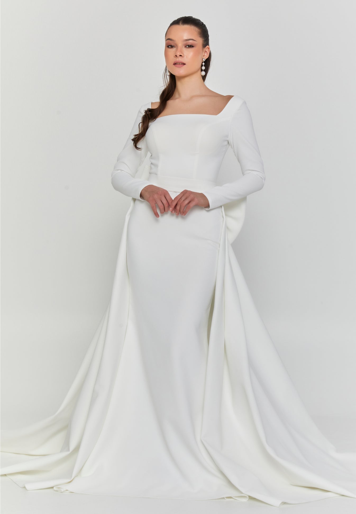 The structured bodice features a wide square neckline that flatters the collarbone and elongates the neck, framed by long fitted sleeves that add poise and timeless appeal. The gown’s smooth crepe fabric glides over the figure before flaring into a graceful train. Unfussy, but absolutely unforgettable.