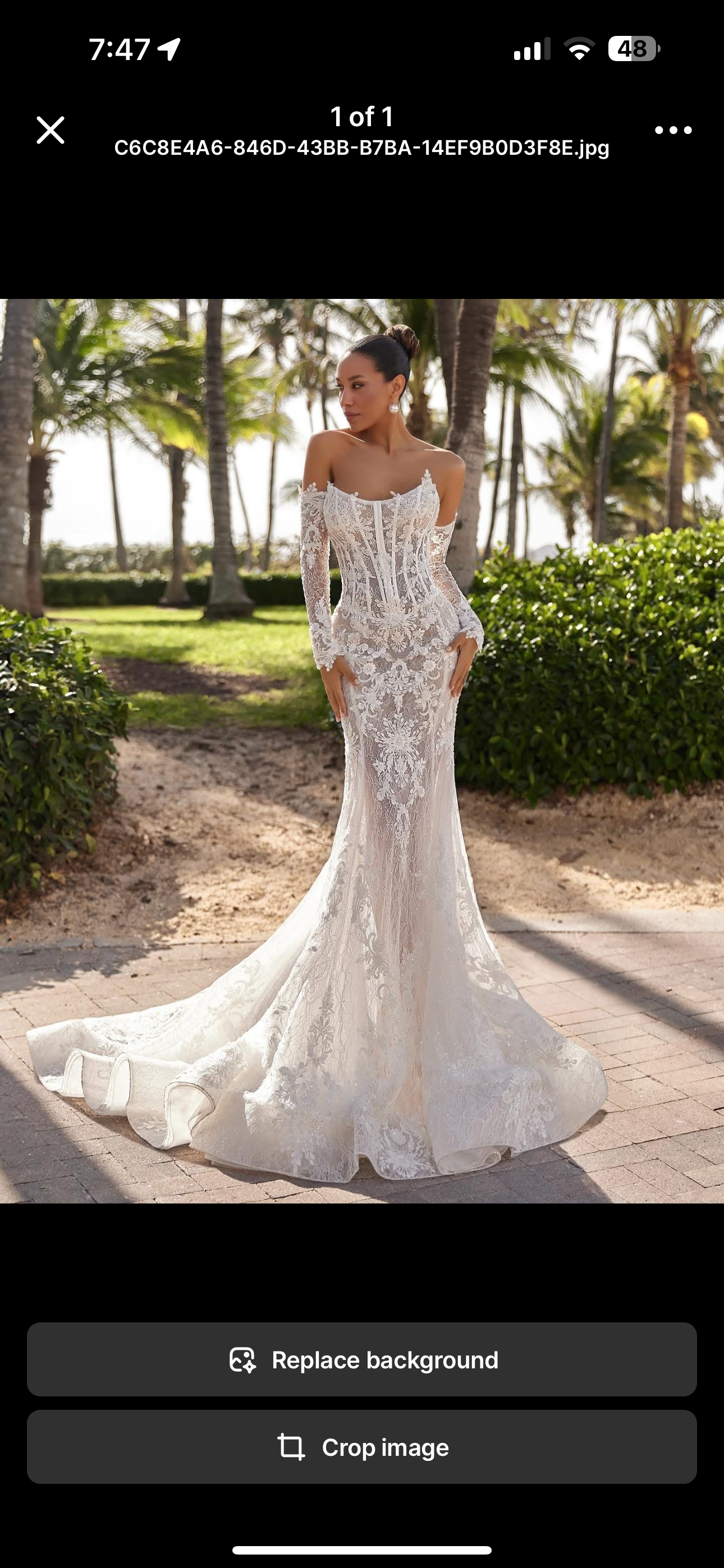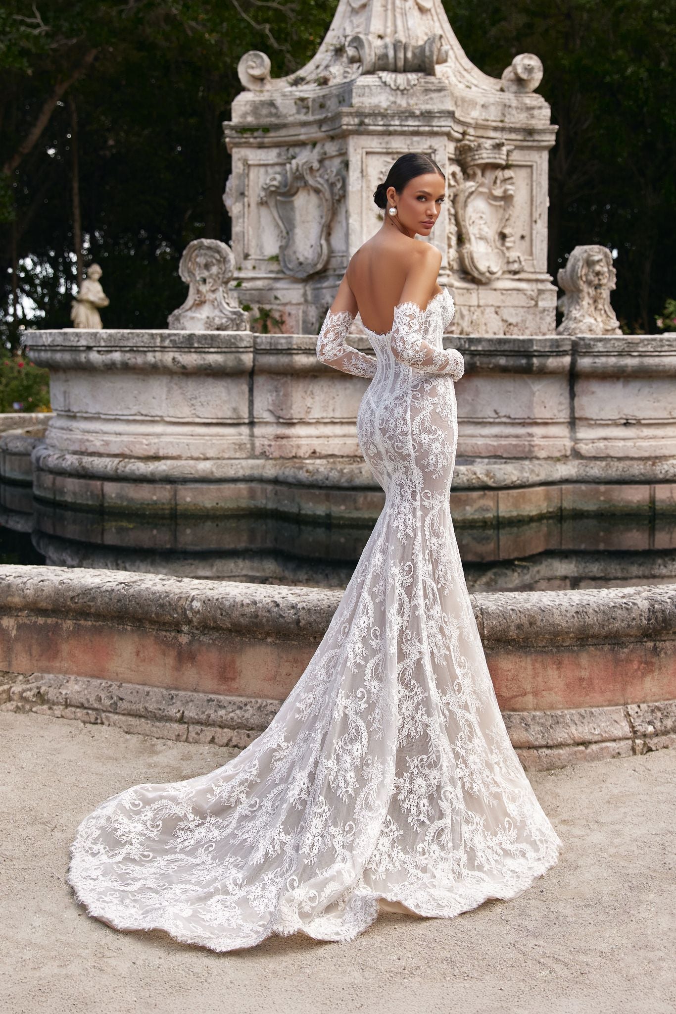 Contact for PriceKeren is a celebration of sweet romance . Can be strapless too. This fit-and-flare silhouette features a sculpted bodice with a deep illusion plunge, framed by textured floral appliqués that bloom across every curve. The sheer corset back and soft chapel-length train create a dreamy, weightless finish.