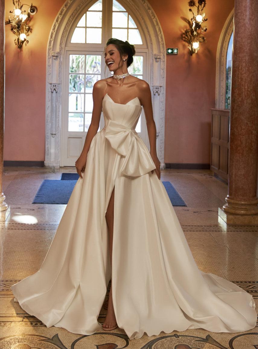 Contact for PriceLisa is designed for a queenly kind of romance. This structured satin ballgown stuns with its intricately beaded bodice, featuring a sweetheart neckline and swirling silver embroidery. Optional off-the-shoulder sleeves add a touch of softness, while the full pleated skirt brings drama without distraction. Regal, radiant, and unforgettable.