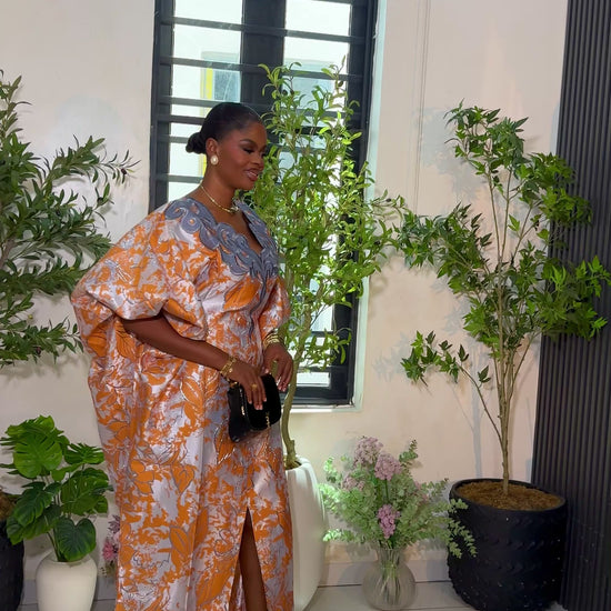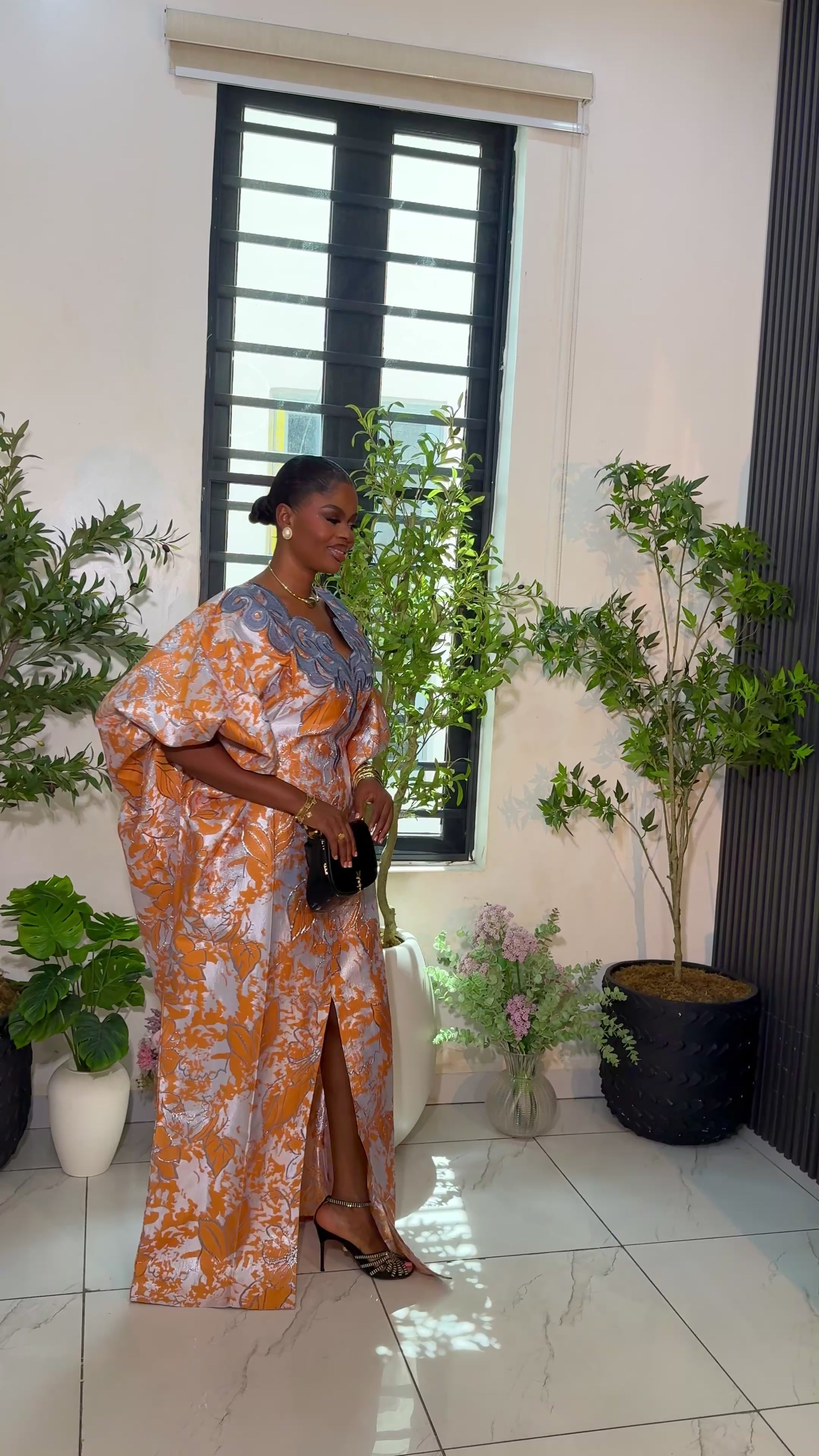 The boubou dress exudes stunning sophistication and allure, crafted from luxurious Damask. Owning this piece is like a dream come true, ideal for any gathering or event. For an added touch of elegance, pair it with the include scarf to complete your look.