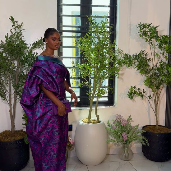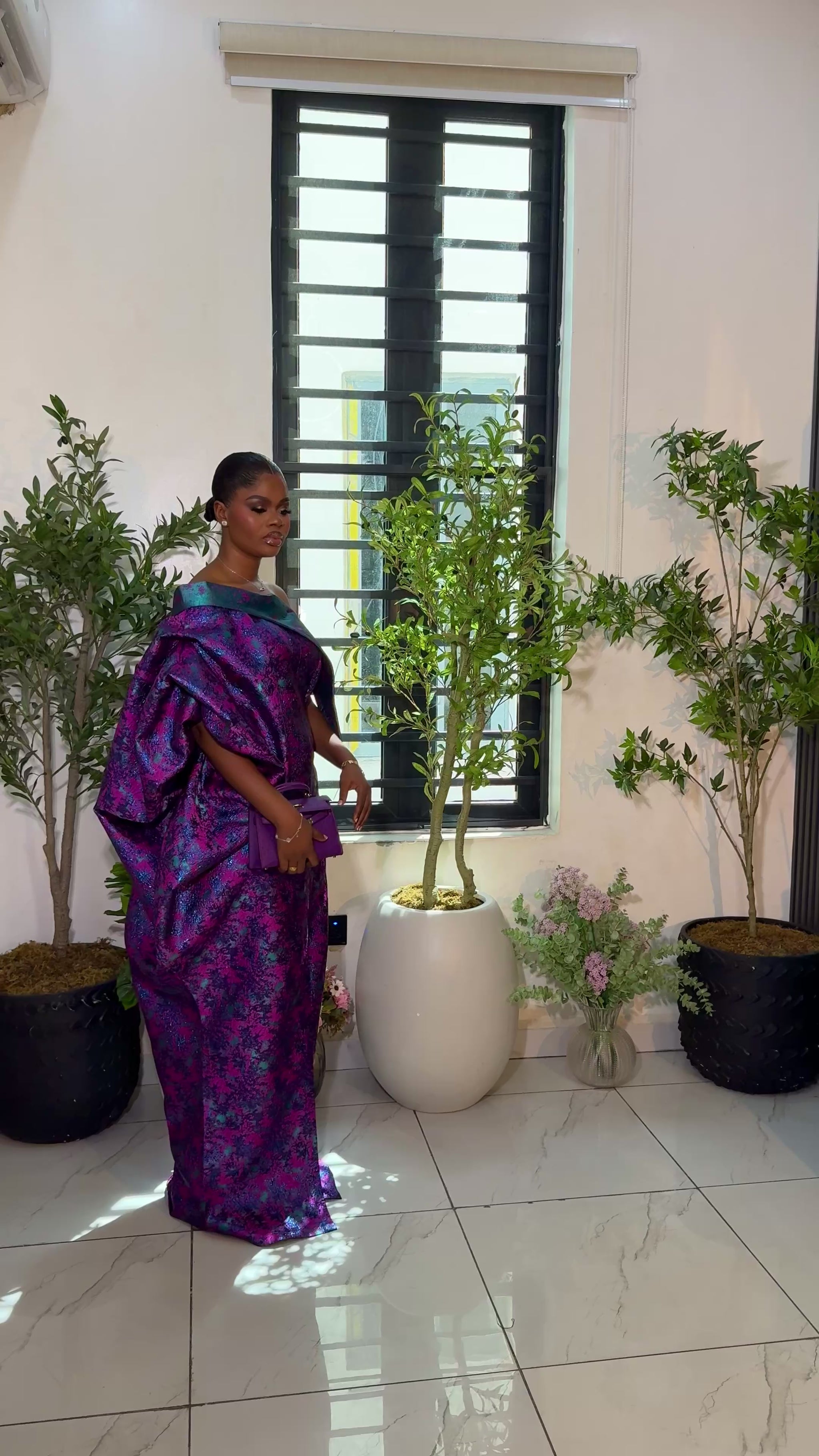 Turn heads in this luxury brocade Boubou — designed to flatter with a hidden waist-cinching belt for the perfect silhouette. It features a matching scarf to complete your look. Class, comfort, and elegance in one timeless piece.