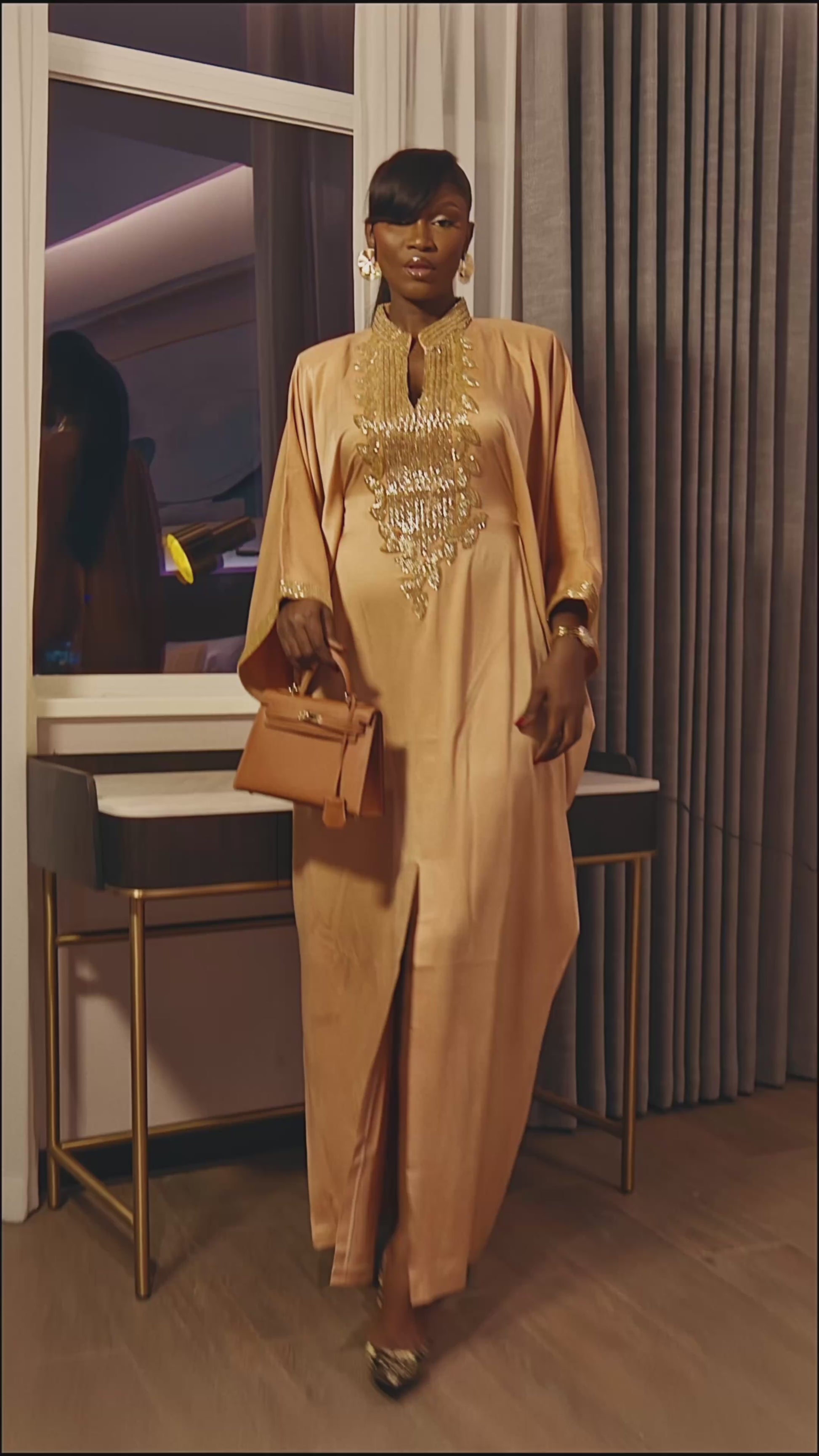 This beautiful dress had an inner belt attached to make it fit. One size fits all. Can be worn in two ways; You can tie the inner belt to make it fitted or leave it as a boubou.