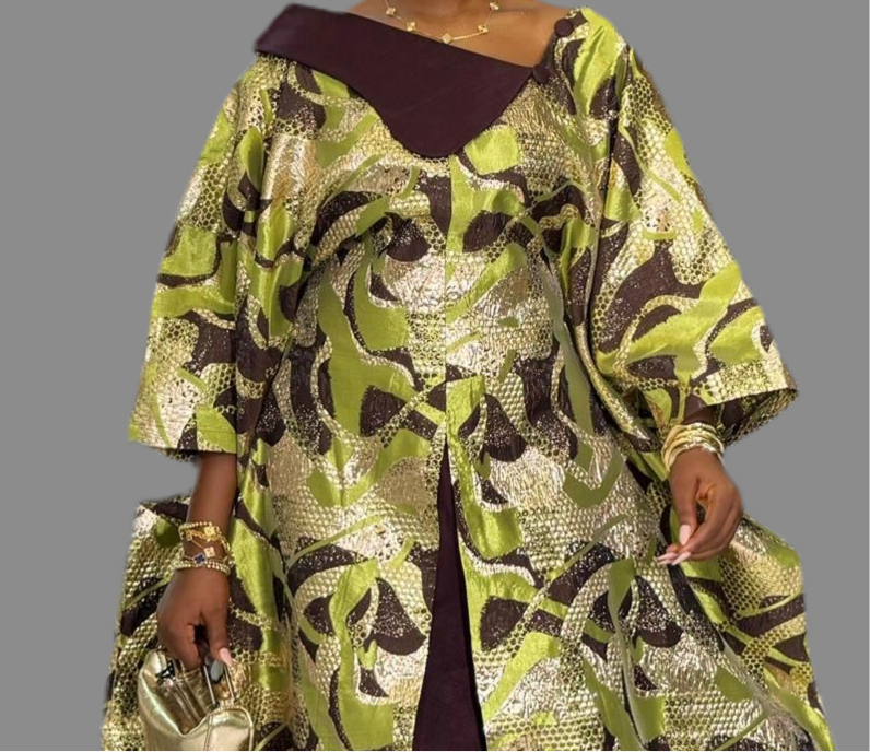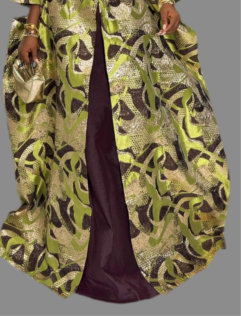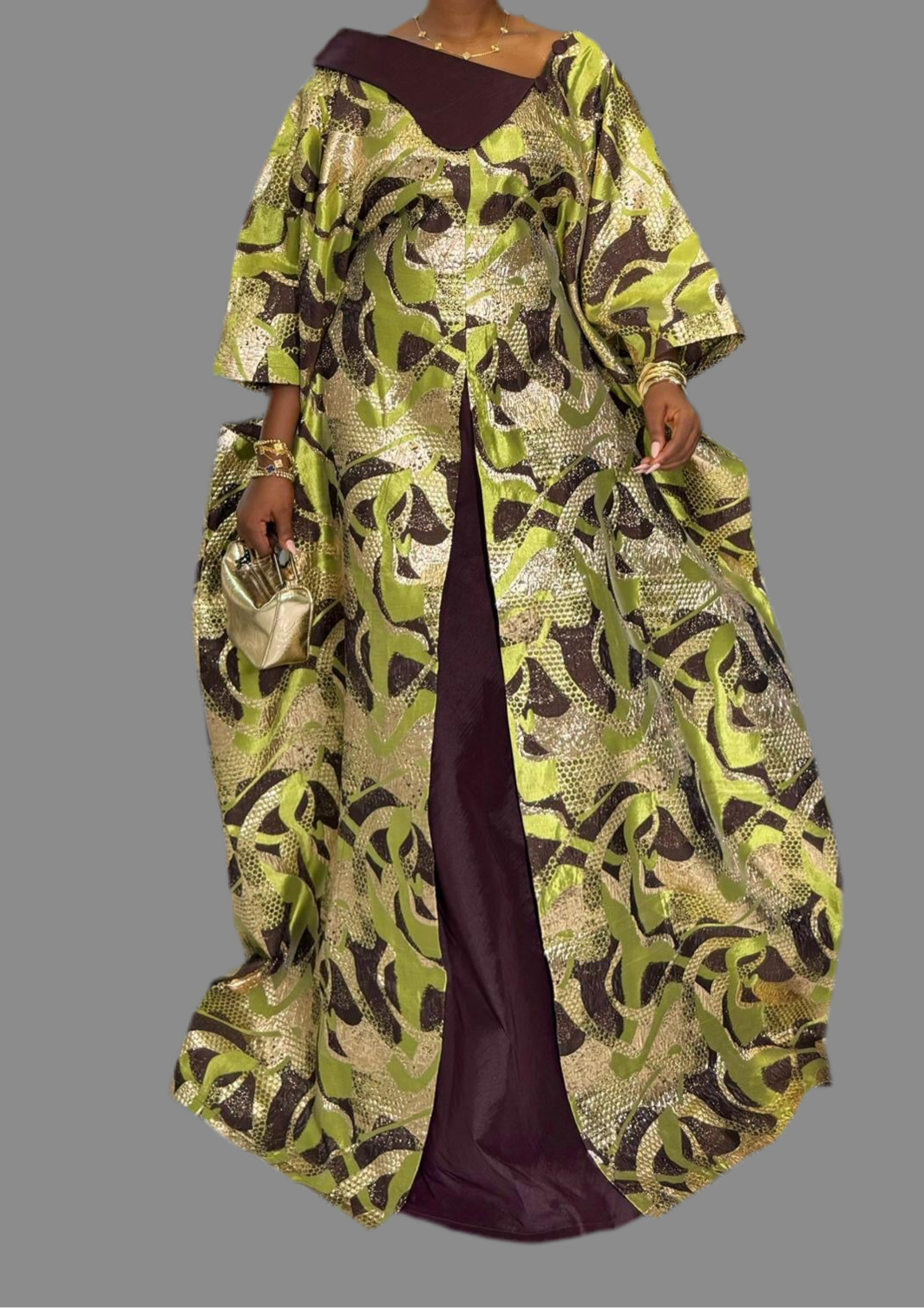 Step into timeless elegance with this masterpiece Boubou, a luxurious statement piece made from premium brocade and taffeta. This stunning ensemble features a bold patterned design with rich burgundy undertones, an asymmetric neckline for a modern twist, and a flowing silhouette that flatters every shape. The gown includes a coordinating scarf and a hidden inner belt to cinch the waist as desired, combining tradition with contemporary flair. Perfect for weddings, celebrations, or when you simply want to stand out with grace.