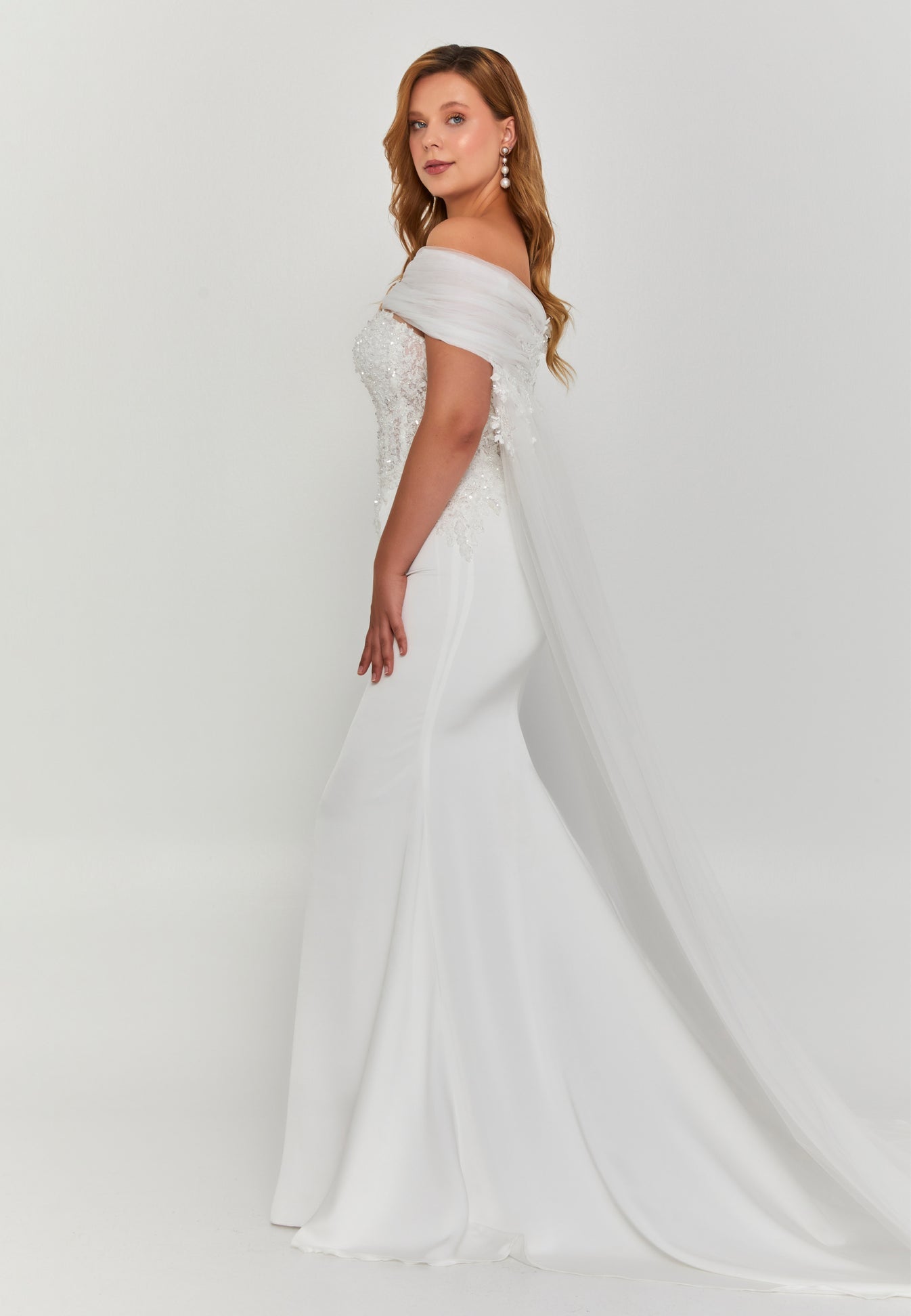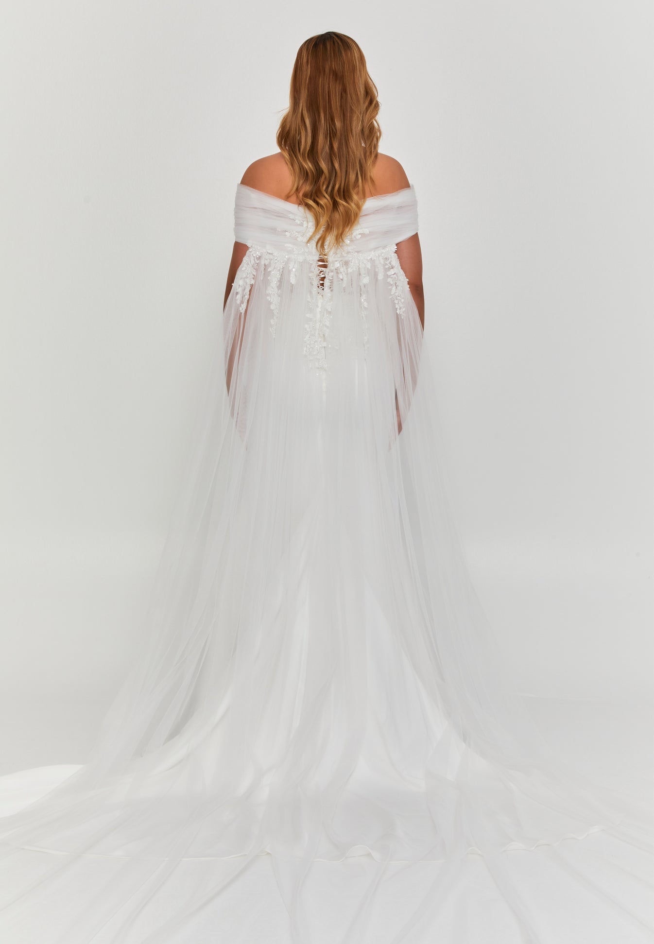 • Off-the-shoulder sheer tulle sleeves with flowing cape overlay