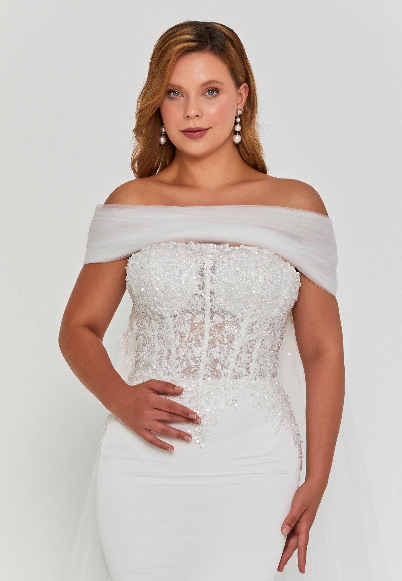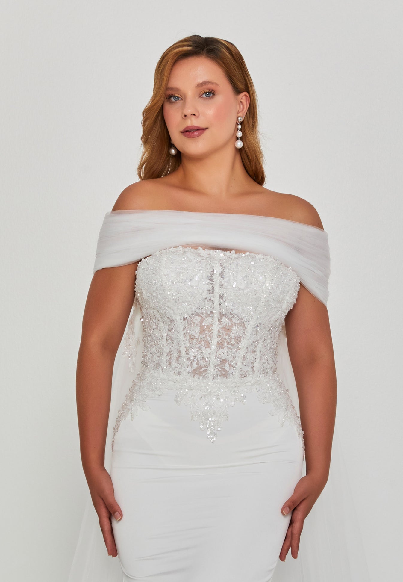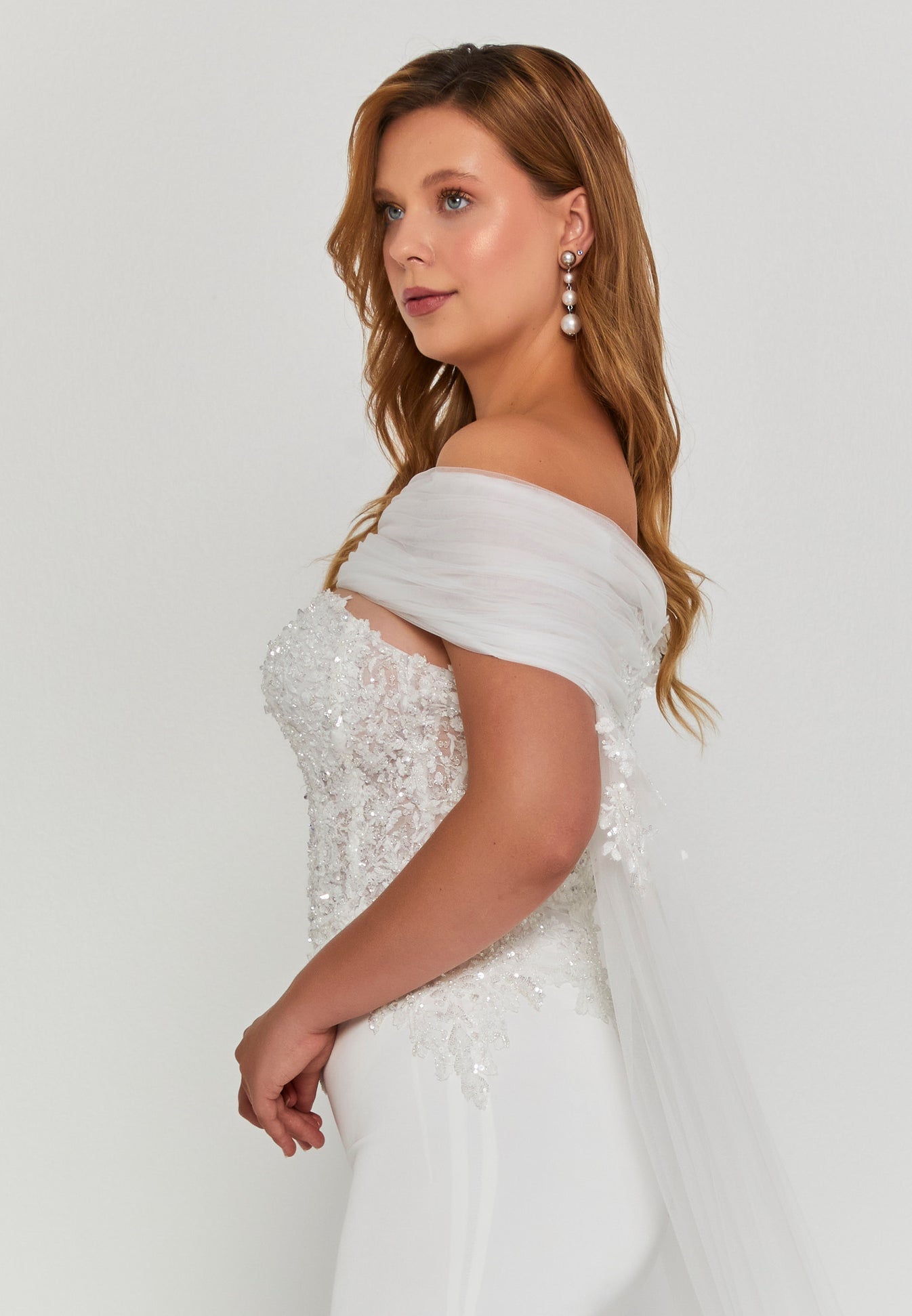 Contact for PriceA soft shimmer radiates from the Maria gown, where delicate beadwork and sheer tulle combine to dramatic effect. The fitted silhouette hugs the figure before flowing out into a clean, chapel-length train, offering a modern contrast to the dreamy textures above. Off-the-shoulder tulle sleeves sweep gracefully over the arms, floating into a cape-like veil at the back that moves with ethereal softness.