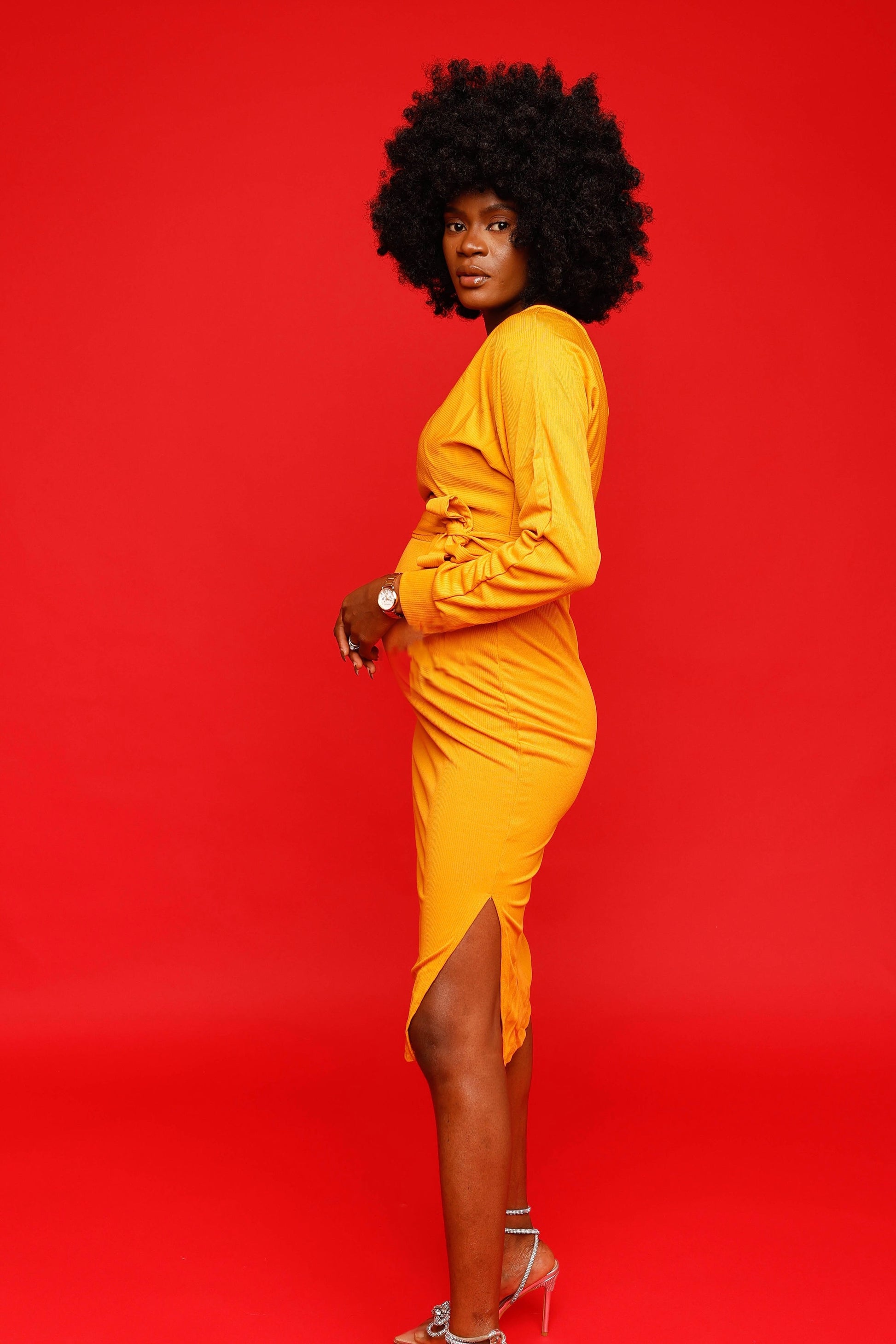 Long sleeve dress, knee length. Comes with the belt. Available in S, M, L, and XL