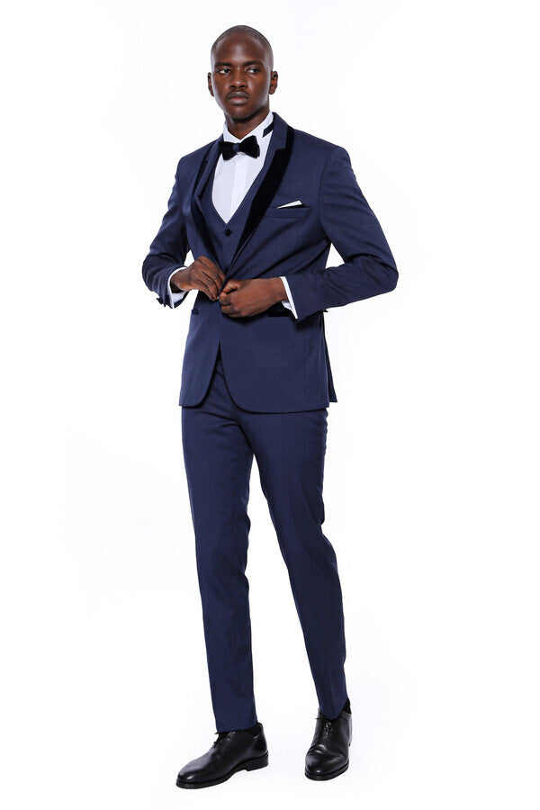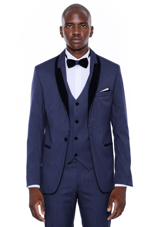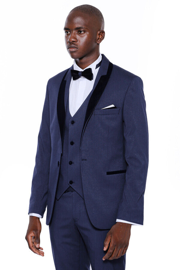 Refined and ready for the spotlight. This navy tuxedo features a slim fit and an understated textured weave that elevates it beyond basic formalwear. Its black velvet shawl lapel adds depth and contrast, while the matching vest completes the sleek silhouette.