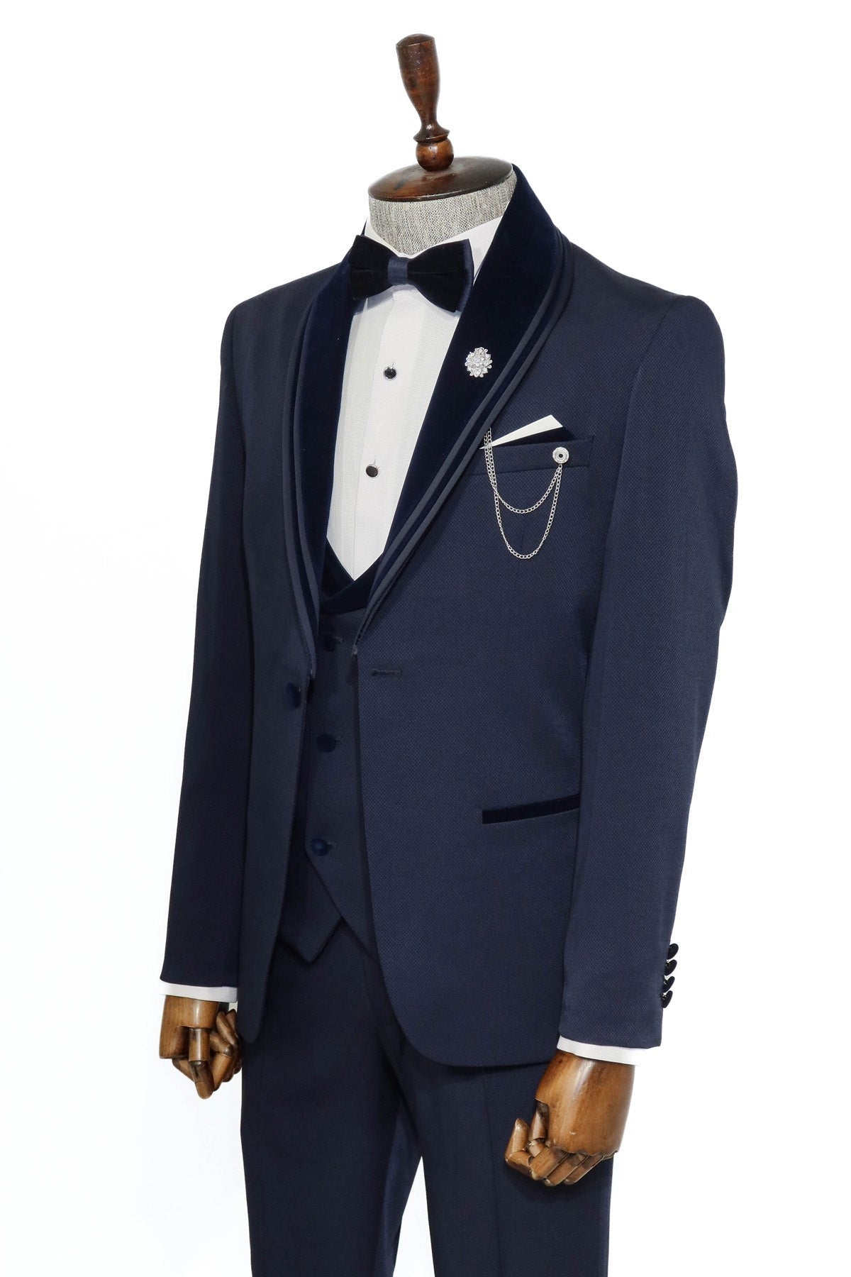 Tailored to impress, this navy three-piece tuxedo delivers refined texture with a confident finish. Designed with a subtle self-patterned fabric, deep navy velvet shawl lapel, and tone-on-tone trim detailing, it’s all about balance. Classic structure with elevated modern touches.