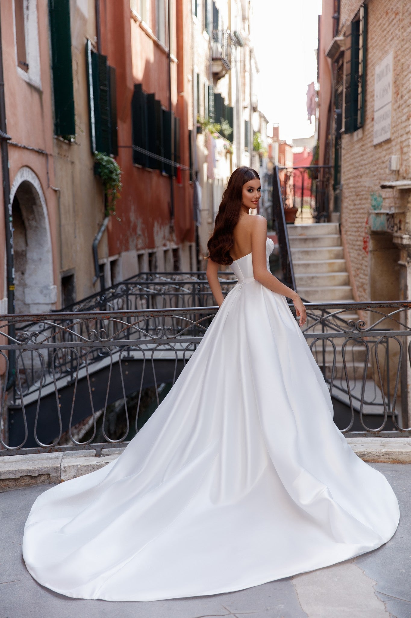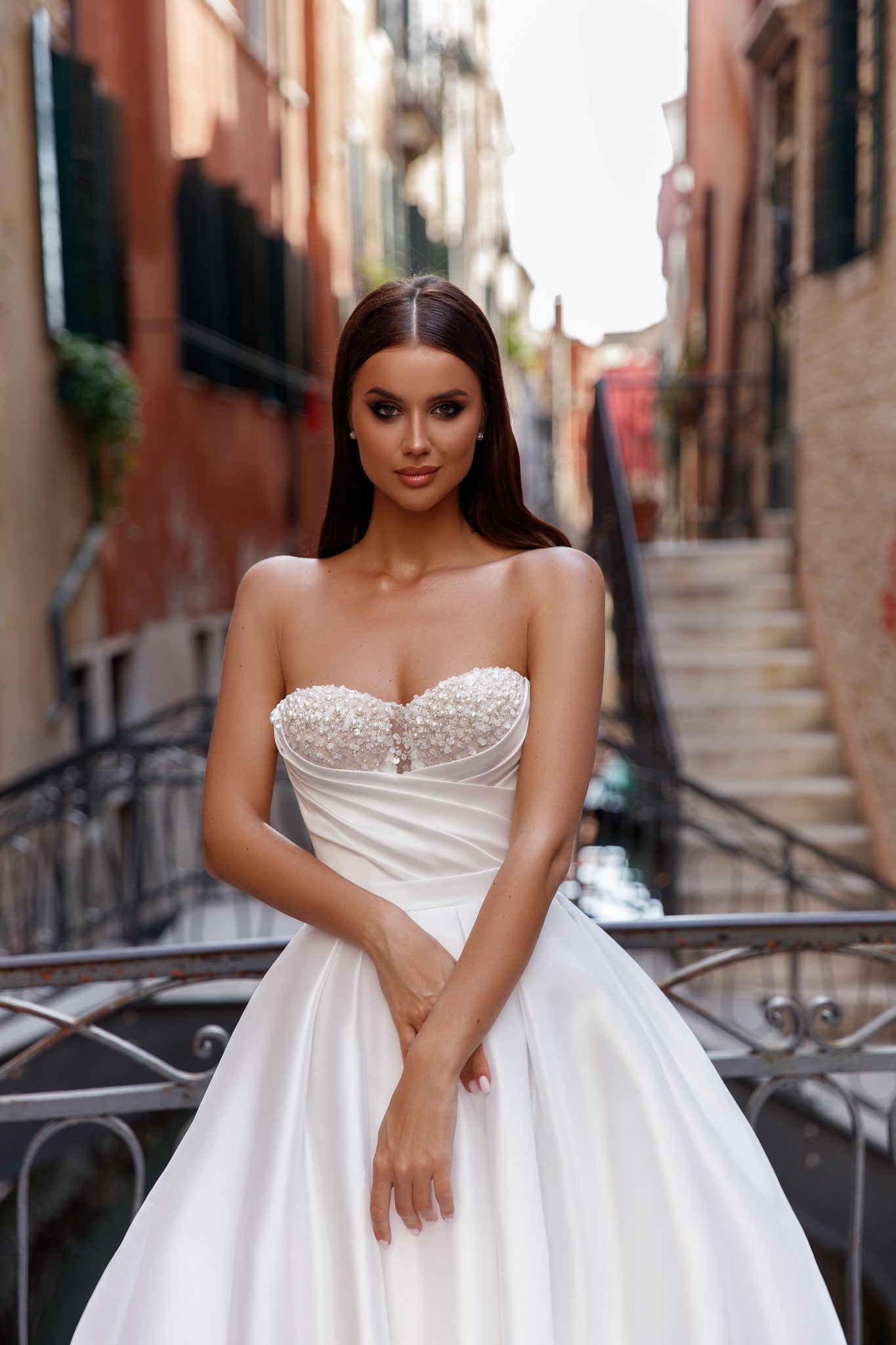 Contact for PriceNina speaks for herself. This structured satin ballgown stuns with its intricately beaded bodice, featuring a sweetheart neckline and swirling silver embroidery. Optional off-the-shoulder sleeves add a touch of softness, while the full pleated skirt brings drama without distraction. Regal, radiant, and unforgettable.