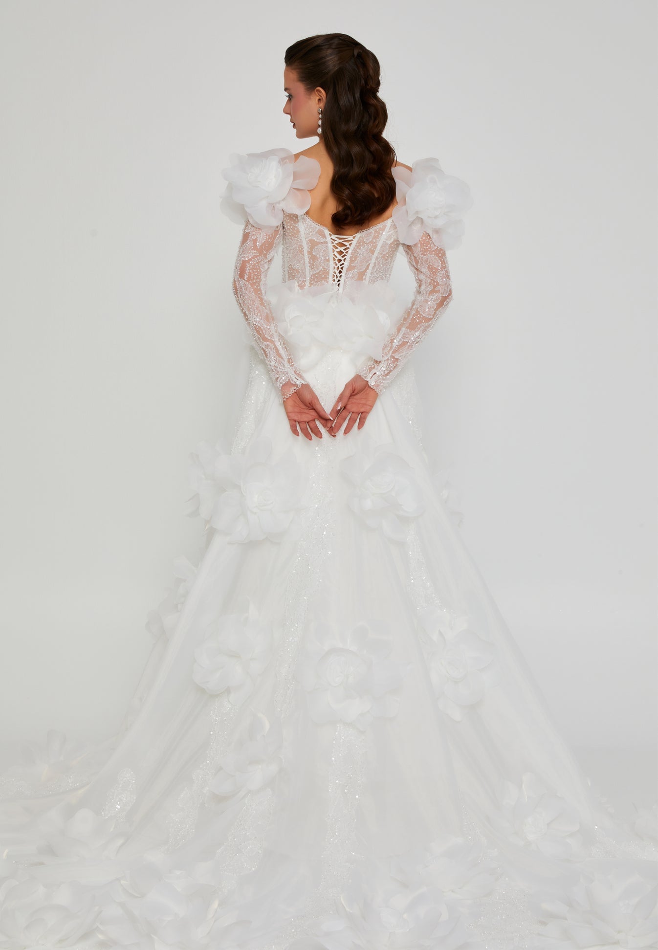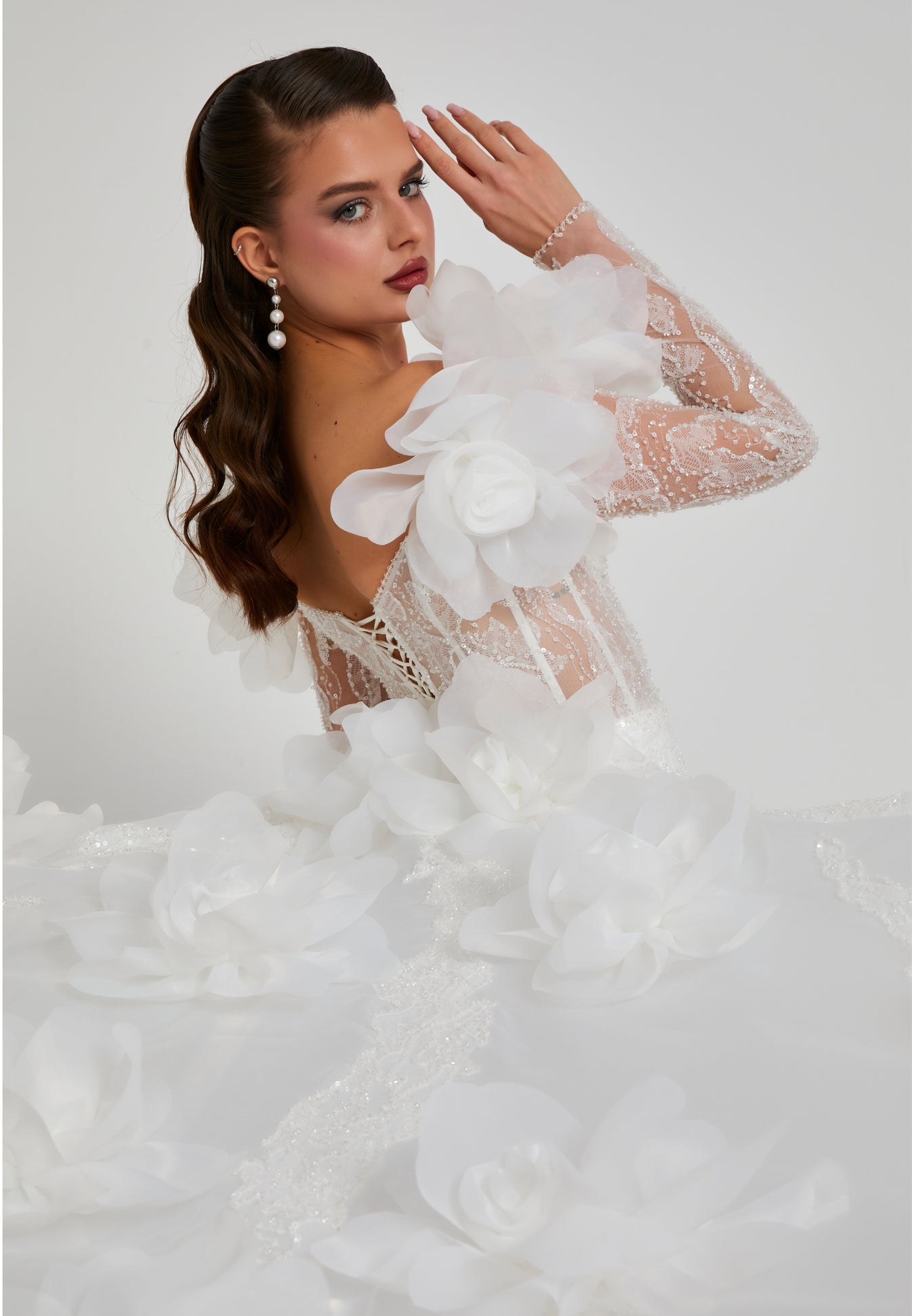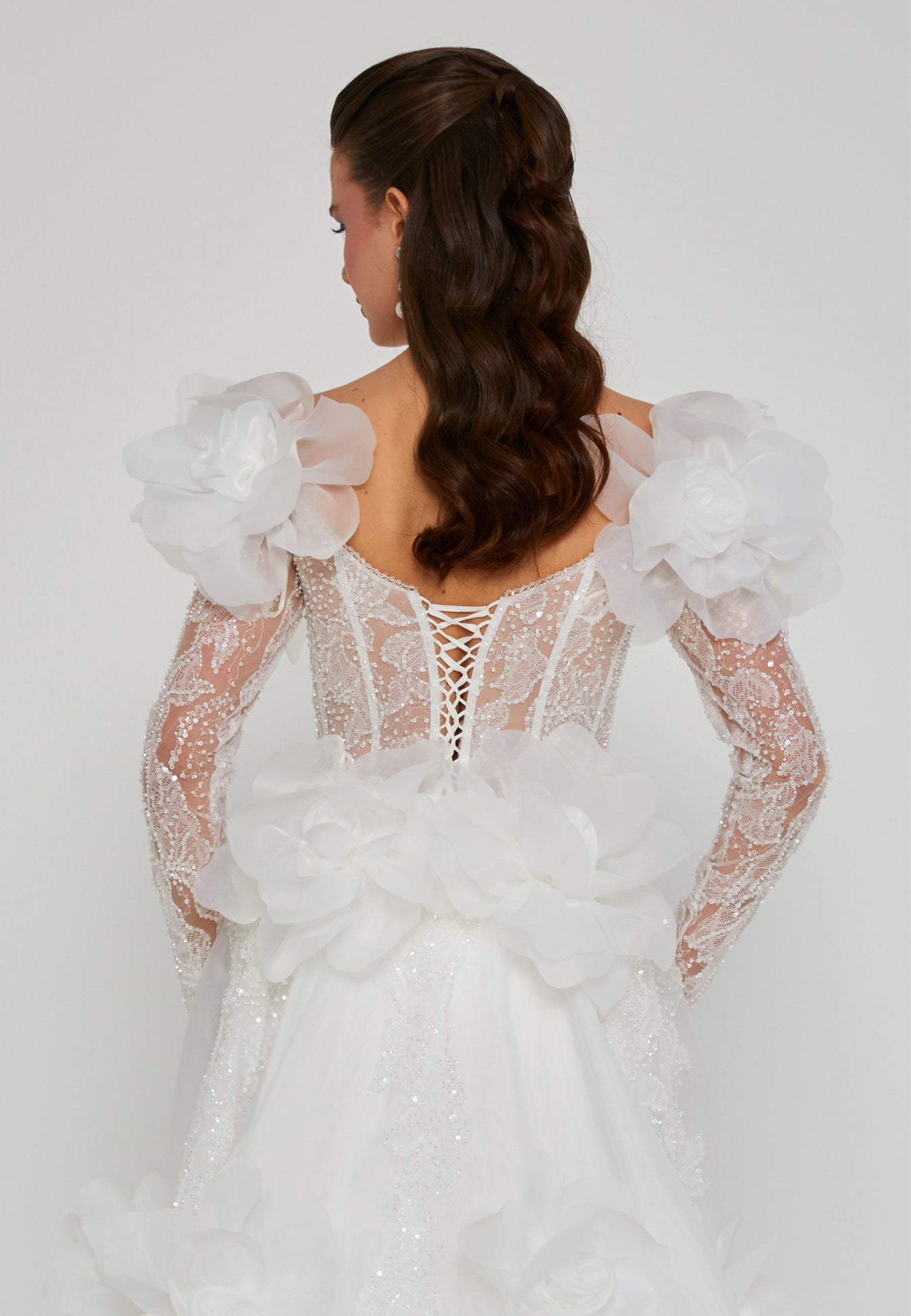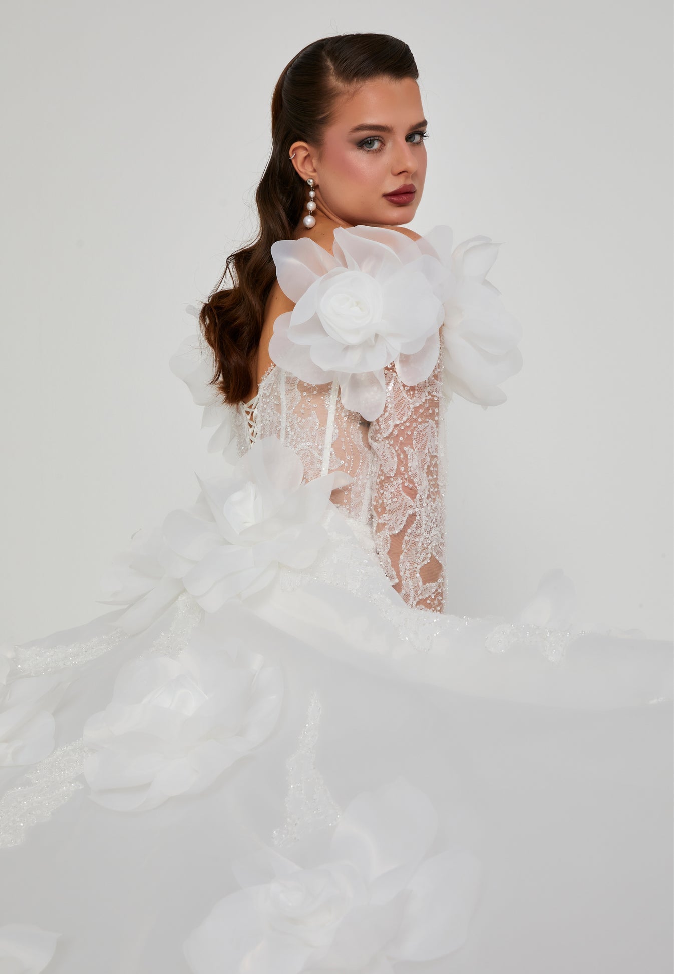 This is a showstopper in every sense. The structured corset bodice is sheer and sculpted, with delicate beadwork and artful lace sleeves that shimmer under the light. Bold 3D floral appliqués bloom from the shoulders and cascade down the sweeping overskirt, giving the dress a couture-level sense of presence.