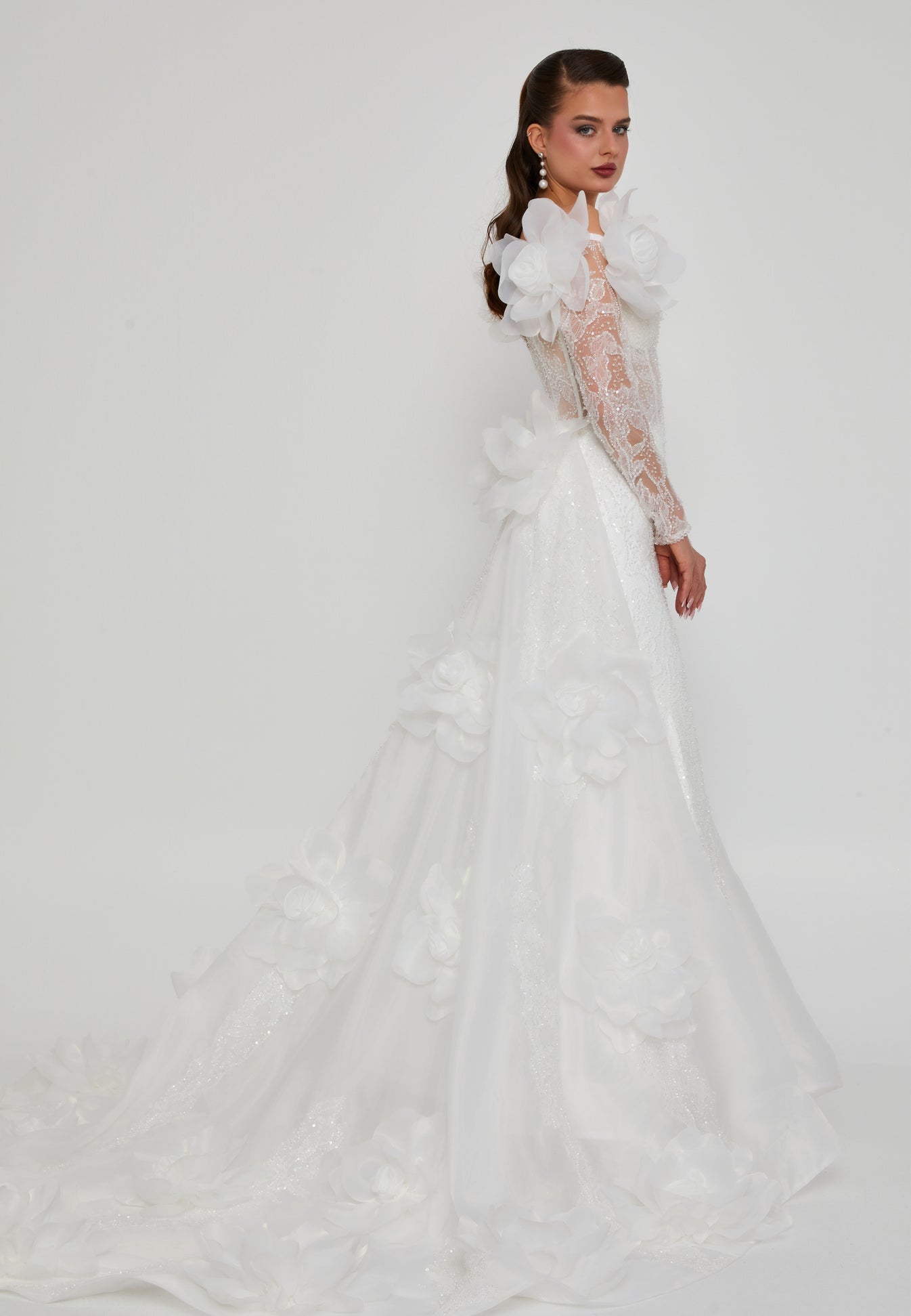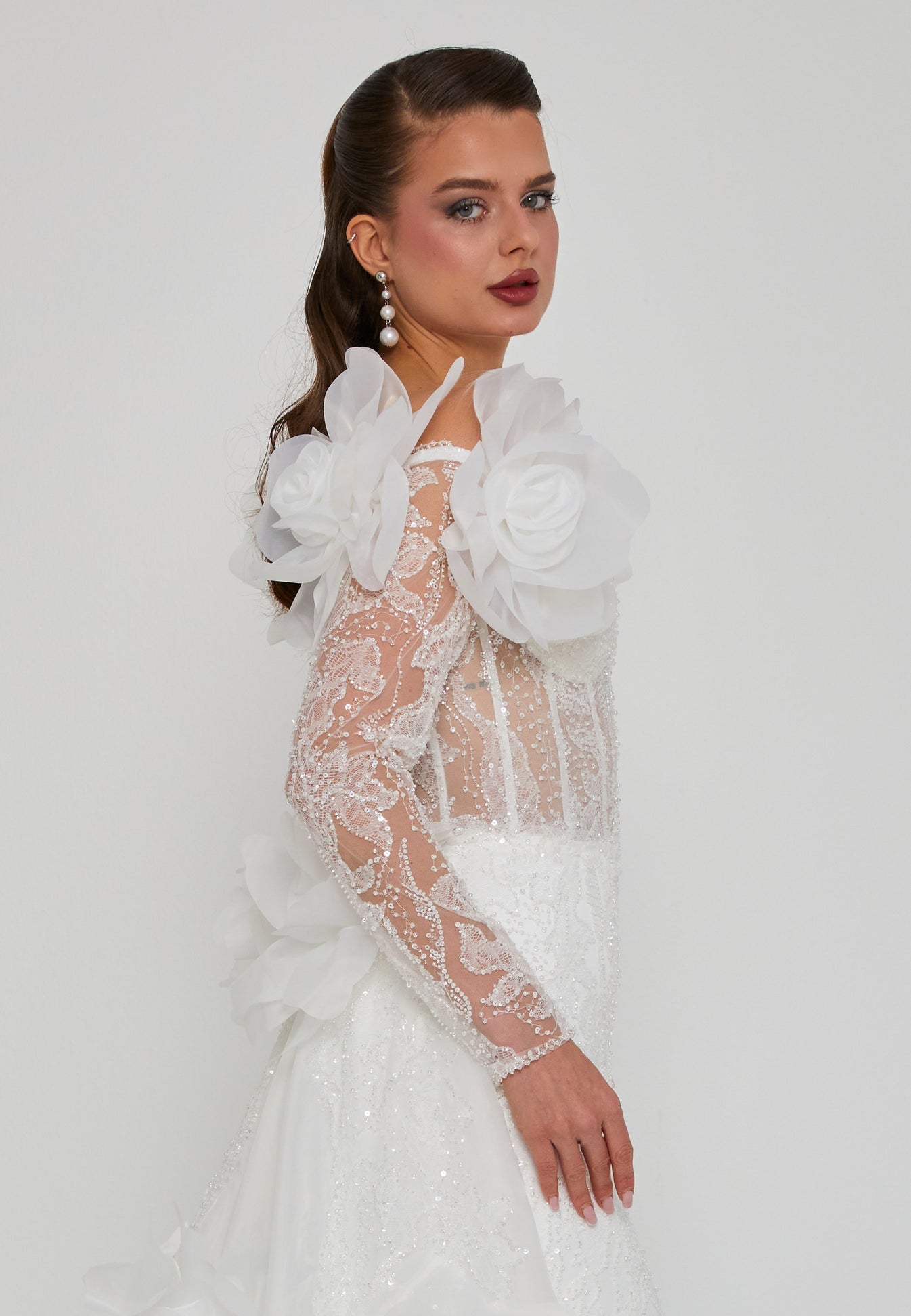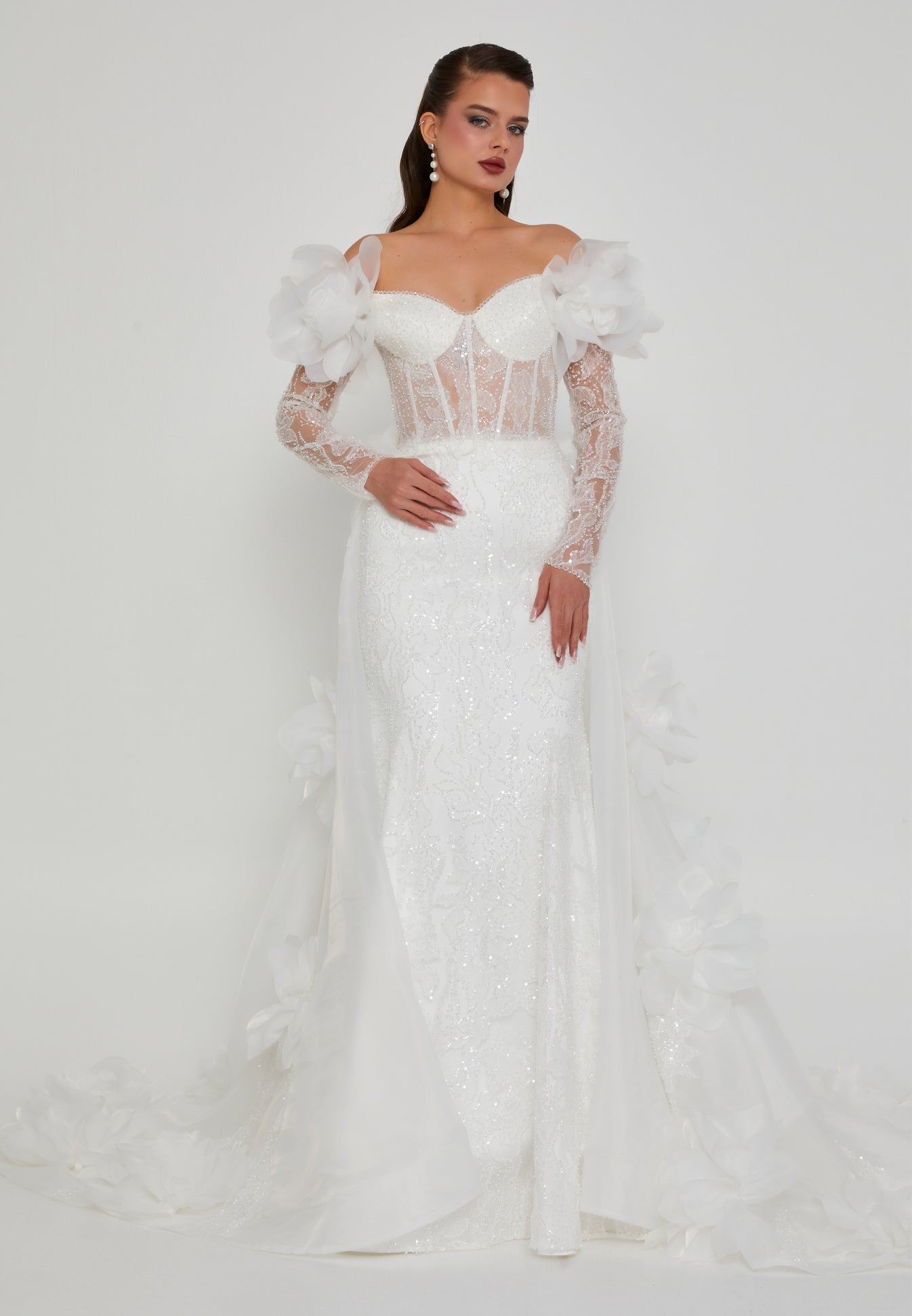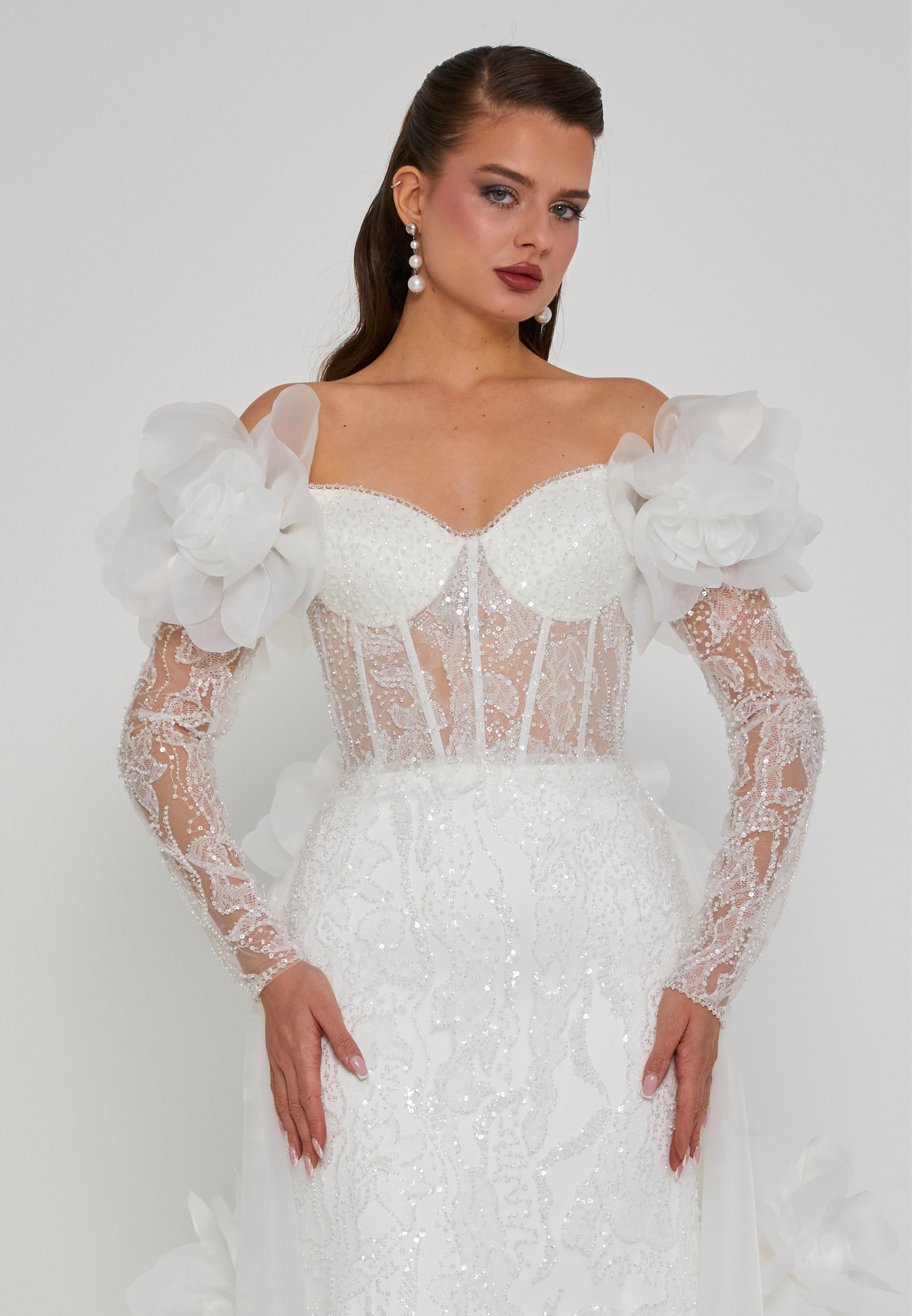 This is a showstopper in every sense. The structured corset bodice is sheer and sculpted, with delicate beadwork and artful lace sleeves that shimmer under the light. Bold 3D floral appliqués bloom from the shoulders and cascade down the sweeping overskirt, giving the dress a couture-level sense of presence.
